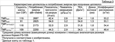 Кроме того, также видно, что свойства прочности (показатель прочности на разрыв и показатель разрушения, TEA) целлюлоз, приготовленных в соответствии с изобретением (TMPHP1Fе и TMPHP2Fе) схожи со свойствами прочности образцов TMP (см. таблицу 1 и 2).