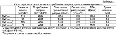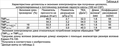Уровень экономии электроэнергии для TMPHP1FеEDTA является тем же самым, как для TMPHP1Fе, например, примерно 20%, при сравнении с потреблением энергии образцов (TMPRef1 и TMPRef2). В экспериментах TMPHP1FеEDTA свойства прочности (например, показатель прочности на разрыв и TEA) являются, однако, улучшенными или сильно улучшенными, по сравнению с TMPRef1 и улучшенными по сравнению TMPHP1Fе, (сравните таблицы 3 и 4). Способность рассеивать свет, важный параметр для печатной бумаги, сохраняется на том же самом уровне, как для образцов (TMPRef1 и TMPRef2). Распределение волокон по длине и ширине было схожим со значениями для образцов TMP (TMPRef1 и TMPRef2, см. фиг.2-3). Это подразумевает, что настоящее изобретение сильно улучшает эффективность использования энергии и свойства прочности полученной целлюлозы с сохранением способности целлюлозы рассеивать свет.