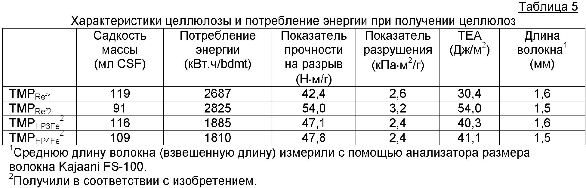 TMP, полученную в соответствии с настоящим изобретением, используя кислоту пероксида водорода (H2O2), получили добавлением 0,08 % по массе сульфата железа (FeSO4 · 7 H2O) на основе массы абсолютно сухой древесины в отверстие рафинера первичного рафинера и 2,2 % по массе пероксида водорода (H2O2) на основе массы абсолютно сухой древесины в продувочный трубопровод первичного рафинера. pH полученной целлюлозы составил 3,3. Целлюлоза обозначена как TMPHP3Fе на фиг.5 и в таблицах 5-6.