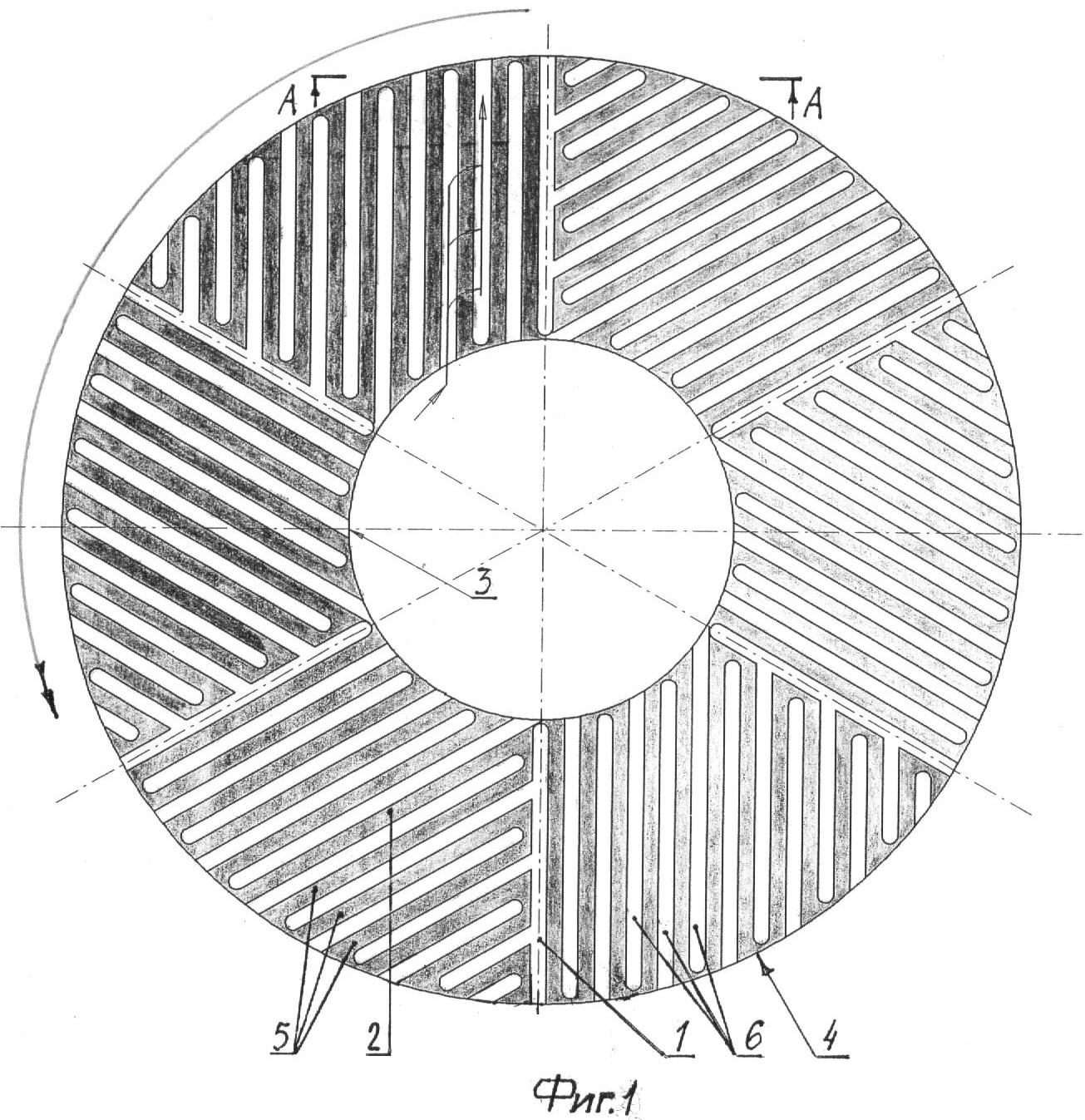На фиг.1 изображена фронтальная проекция рабочей стороны размалывающей гарнитуры дисковой мельницы (поверхности ножей затенены); на фиг.2 – поперечный разрез А-А единичного ножа и смежной с ним межножевой канавки (одинарными стрелками показано направление движения волокнистой суспензии в ножевых канавках размалывающей междисковой полости; двойной окружной стрелкой показано направление вращения ротора).