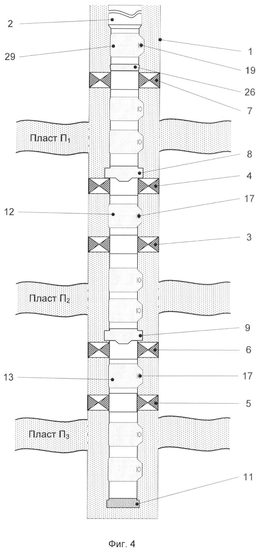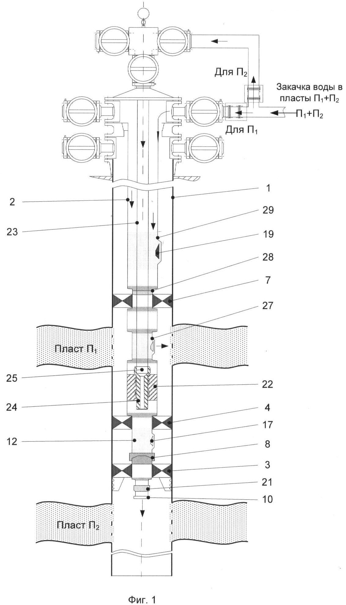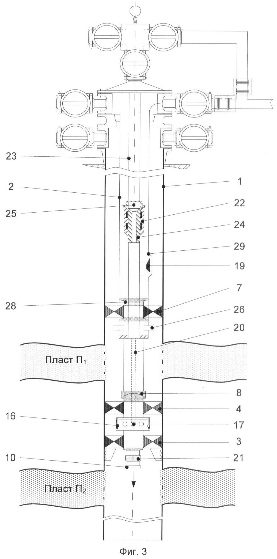 При монтаже установки заглушенный нижний конец 11 (например, см. фиг.2) колонны труб 2, в частном случае, выполняют в виде срезного узла с возможностью срабатывания его как от механического удара (штангой и ясом), так и от избыточного давления, для открытия прохода труб под пакером 3 после посадки и проверки герметичности пакеров 3, 4, 7. Также для возможности повторной опрессовки герметичности компоновки под нижним пакером 3 выше заглушенного 11 нижнего конца колонны труб 2 устанавливают ниппель 21 для установки в него опрессовочного клапана меньшего диаметра. Кроме того, между пакерами 3 и 4 (фиг.1, 2) или выше (фиг.3) верхнего пакера 7 на колонне труб 2 спускают посадочное устройство 22, причем после герметичной посадки этих пакеров спускают на дополнительной колонне труб 23 малого диаметра и устанавливают в посадочное устройство 22 разобщитель 24, без или с посадочным гнездом 25 под шар или клапан, тем самым разделяют полости колонн труб 2 и 23 между собой, и обеспечивают разные независимые каналы для движения в них потока среды для пластов П1 и П2. При этом для потока верхнего пласта П2 между пакерами 4 и 7 устанавливают либо перепускной узел 26 (фиг.3), либо скважинную камеру 27 (фиг.1, 2). Причем в скважинной камере 27 при монтаже колонны труб 2 с пакерами 3, 4 и 5 находится глухая пробка (подобно позиции 19), которая извлекается с помощью канатной техники пред спуском колонны труб 23 в скважину 1.