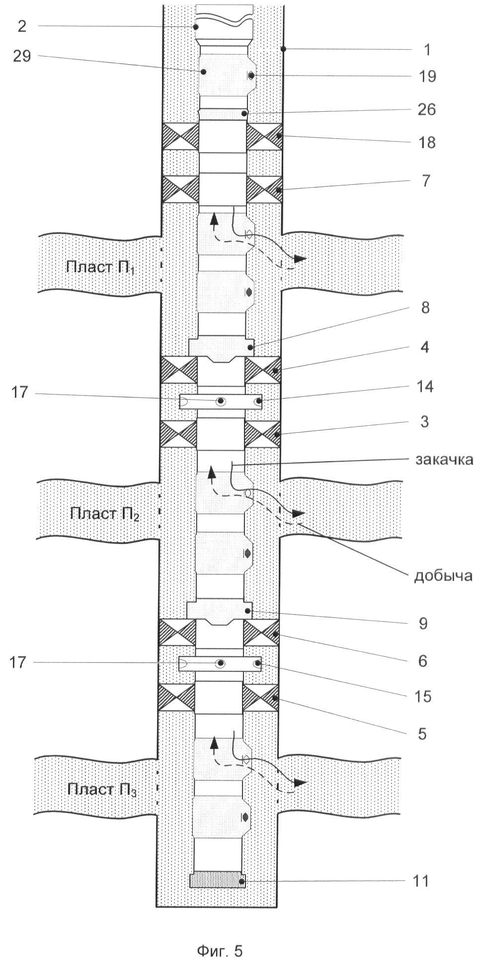 Также при монтаже установки над верхним пластом П1, в частном случае, устанавливают один 7 (фиг.1-4) или, для надежности, два 7 и 18 пакера (фиг.5), и проверяют его или их на герметичность, сверху и/или снизу, подавая жидкость в затрубное пространство скважины 1 и/или в колонну труб 2. При этом между пакерами 7 и 18 может быть также установлен перепускной элемент для опрессовки их на герметичность.