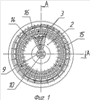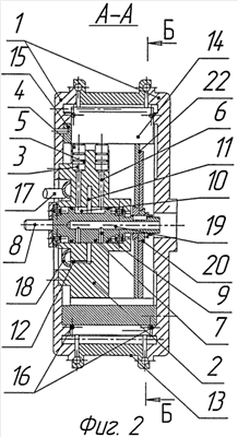 Подвижное жесткое зубчатое колесо 13 соединяется с плунжерами 14 зубчатой муфтой 1. Плунжеры 14 равномерно расположены по окружности и фиксируются от угловых перемещений относительно друг друга сепаратором 15, жестко закрепленным на зубчатой муфте 1, и от осевых перемещений крышками корпуса, роль которых выполняют зубчатые муфты 1. В пазы плунжеров 14 установлены гибкие металлические тросы 16, рабочее тело подводится через штуцер подачи 17, коллектор 18 и осевые каналы 12. На валу распределителя 8 установлены и зафиксированы от осевых перемещений гайкой 21 эксцентрично смещенные в противоположных диаметральных направлениях эксцентрики 20, которые совершают вращательное движение вместе с распределителем 8. На эксцентрики 20 установлены диски 22, контактирующие с плунжерами 14.