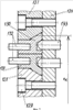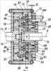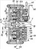 Четырехскоростной орбитальный редуктор (фиг.2) содержит корпусные детали: крышку корпуса 36, кольцо корпуса 37, кольцо подшипника 38 и крышку 39. Крышка корпуса 36 и ограничитель 40 образуют стенку корпуса. Корпус, собранный из указанных деталей, имеет общую ось 6, соосно которой установлен быстроходный вал 41 и тихоходный вал 42. На быстроходном валу закреплен эксцентрик 43, ось 44 которого параллельно смещена относительно оси 6 на величину е. Диск 45 надет по ходовой посадке на эксцентрик 43. Ролики 46, 47 и 48 установлены в отверстиях диска 45, расположенных по концентрическим окружностям с центром на оси 44. Ролики 49 установлены в отверстиях диска 50, равнорасположенных по окружности с центром на оси 6. Тихоходный вал 42 скреплен с диском 50. Ролики 51, 52 и 53 равномерно расположены по концентрическим окружностям с центром на оси 6. Каждая группа этих роликов установлена в соответствующих держателях 54, 55 и 56, которые имеют возможность вращения вокруг оси 6. В центральном отверстии крышки корпуса 36 установлена по скользящей посадке втулка 57, которая сопряжена по ходовой посадке с быстроходным валом 41. На ограничителе 40 установлен по ходовой посадке держатель 58 зубчатого колеса 59. Штифты 60 установлены в отверстиях держателя и колеса и связывают их. Держатель 40 жестко крепится к крышке корпуса 36 винтами 61 и штифтами 62. В крышке корпуса 36 в отверстиях, расположенных на концентрических окружностях, установлены гидравлические толкатели 63, закрытые крышкой 64, закрепленной винтами 65 и 61. Штуцер 66 ввинчен в крышку 36. Внутреннее отверстие штуцера сообщается с кольцевой полостью 67. Таких полостей в крышке 36 – четыре, по количеству рядов толкателей 63. В каждую полость 67 выходит ряд полусферических головок толкателей. К каждому штуцеру 66 (их четыре, по одному на каждую полость) крепят гидравлический шланг, предназначенный для подачи масла под давлением (не показан). Шайба 68 закреплена на ограничителе 57 винтами 69. Между кольцом подшипника 38 и диском 50 установлены игольчатые ролики 70. Ограничитель 71 закреплен на кольце корпуса 37.