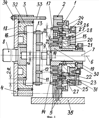 Редуктор орбитальный содержит корпусные детали: крышку корпуса 1, кольцо корпуса 2, кольцо подшипника 3 и крышку 4. Крышка корпуса 1 и деталь 26 образуют стенку корпуса 5. Корпус, собранный из указанных деталей, имеет общую ось 6, соосно которой установлен быстроходный вал 7 и тихоходный вал 8. На быстроходном валу 7 закреплен эксцентрик 9, ось 10 которого параллельно смещена относительно оси 6 на величину е. Диск 11 надет на эксцентрик 9 по ходовой посадке. На нем выполнены два ряда отверстий, расположенных по концентрическим окружностям с центром на оси 10. В отверстиях диска 11 установлены ролики 12 и 13, которые зацеплены соответственно с роликами 14, 15, 16 и 17. Ролики 16 установлены в отверстиях диска 18 и равномерно расположены по окружности с центром на оси 6. Диск 18 скреплен с тихоходным валом 8. Ролики 14, 15 и 17 равномерно расположены по концентрическим окружностям с центром на оси 6. В центральном отверстии крышки корпуса 1 установлена по скользящей посадке втулка 19, которая сопряжена по ходовой посадке с быстроходным валом 7. Ролики 15 установлены в держателе роликов 20, выполненном в виде кольца с внутренним буртиком 21. Ролики 14 установлены в держателе 22, выполненном в виде кольца с наружным буртиком 23. Ролики 17 установлены в держателе роликов 24, выполненном в виде кольца с внутренним буртиком 25. Держатели роликов 22 и 24 сопряжены по ходовым посадкам с ограничителем 26 осевого перемещения указанных держателей роликов. В крышке корпуса 1 установлены толкатели (штифты) 27, на ней же выполнены две резьбы (правая и левая), на которые навинчены гайки 28 и 29. На конце втулки 19 нарезана резьба, на которую навинчена гайка 30. Рычаг 31 связывает гайки 28 и 29. Между диском 18 и кольцом подшипника 3 установлены игольчатые ролики 32. В собранном виде редуктор стянут шпильками 33 и гайками 34 и закреплен на основании 35.