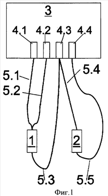 Второй температурный датчик 2 служит, например, для избыточного измерения или контроля температуры. В другом исполнении он может измерять также вторую температуру и/или контролировать ее. Второй температурный датчик 2 с помощью двух проводов 5.4 и 5.5 подключается к измерительному преобразователю 3. При этом один провод 5.4 присоединяется к одинаковой клемме 4.3 как один из трех проводов 5.1, 5.2 и 5.3, в изображенном здесь случае 5.3. Второй провод 5.5 присоединяется к четвертой клемме 4.4. Таким образом, пять проводов 5.1, 5.2, 5.3, 5.4 и 5.5 могут быть подключены только к четырем клеммам 4.1, 4.2, 4.3 и 4.4. Для точного измерения температуры с помощью второго температурного датчика 2 предполагается, что также и оба провода 5.4 и 5.5 имеют одинаковое сопротивление, что и первые три провода 5.1, 5.2 и 5.3. Отсюда достаточно определить электрическое сопротивление только одного провода и использовать эту величину для всех проводов. В качестве альтернативы пять проводов имеют другое, однако, известное соотношение сопротивления. Предпосылка, что все примененные провода 5.1, 5.2, 5.3, 5.4 и 5.5 имеют одинаковое электрическое сопротивление и одинаковую характеристику, в частности, в зависимости от температуры, может быть реализована за счет того, что провода изготавливаются из одинакового материала и в основном одной длины – рисунки выполнены не в масштабе, однако для наглядности увеличены. Далее должно быть обеспечено, чтобы на провода 5.1, 5.2, 5.3, 5.4 и 5.5 воздействовала бы одинаковая температура, т.е. провода 5.1, 5.2, 5.3, 5.4 и 5.5 находятся, например, в одном месте, близко один к другому, в одной измерительной трубе. Для транспозиции соединения, предложенного в соответствии с изобретением, измерительный преобразователь 3 или таким образом взаимосвязанный блок оценки результатов выполнен таким образом, что он с помощью первого температурного датчика 1 определяет величину электрического сопротивления, которое потом используется для всех проводов 5.1, 5.2, 5.3, 5.4 и 5.5. В другом исполнении величины сопротивления пяти проводов 5.1, 5.2, 5.3. 5.4 и 5.5 имеют соответственно известные соотношения. Указанный выше случай является самой простой конфигурацией, при которой величины сопротивления соответственно одинаковы. При отличающихся, однако, известных соотношениях, согласно изобретению может быть определена величина сопротивления проводов.