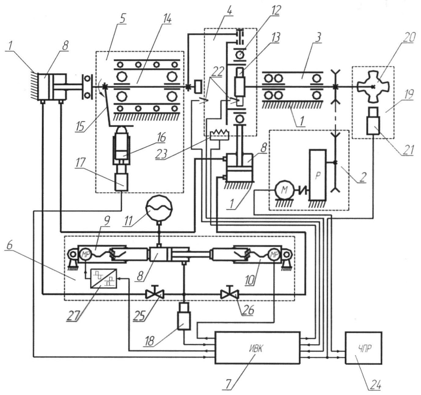 Кроме того, в машине для испытания на трение и износ имеются блок 24 частотного регулирования двигателя приводной станции 2, игольчатые краны 25, 26 и блок 27 усиления сигнала широтно-импульсной модуляции управления шариковой винта-гайки 9.