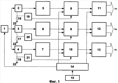 Цифровой феррозондовый магнитометр состоит из формирователя 1 синусоиды, феррозондов 2, 3, 4, избирательных усилителей 5, 6, 7, устройств выборки-хранения 8, 9, 10, аналого-цифровых преобразователей 11, 12, 13, логического блока 14, задающего генератора 15, измерительных резисторов 16, 17, 18, схем температурной компенсации 19, 20, 21 и общей шины 22.