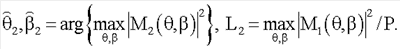 10. Окончательное решение о наличии радиосигналов принимается по значениям максимумов квадратов модулей угловых спектров. Для этого значения максимумов L1 и L2 суммируют и сравнивают с первым порогом С1. Если порог не превышен, принимают решение об отсутствии радиосигналов, иначе определяют и сравнивают со вторым порогом С2 отношение вида