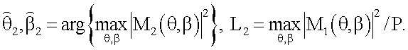 6. Второй этап при диапазонах углов 0 360° и 0 90° и дискретности сетки в 1° выполняется в течение 360·90 циклов и состоит в следующем. Определяют значения нормированной диаграммы направленности АС в направлении координат и максимума углового спектра первого порядка