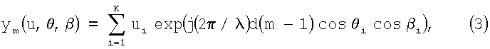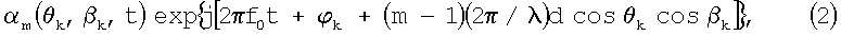 где K – количество источников радиосигнала (ИРИ), uk – амплитуда сигнала k-го ИРИ, – фаза сигнала k-го ИРИ на m-м вибраторе, зависящая от азимутального и угломестного пеленгов k-го ИРИ k и k соответственно, nm – шум, имеющий место на m-м вибраторе, включающий в себя шум мирового фона и аппаратуры.
