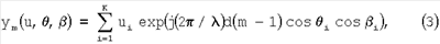 где K – количество источников радиосигнала (ИРИ), uk – амплитуда сигнала k-го ИРИ, m( k, k) – фаза сигнала k-го ИРИ на m-м вибраторе, зависящая от азимутального и угломестного пеленгов k-го ИРИ k и k соответственно, nm – шум, имеющий место на m-м вибраторе, включающий в себя шум мирового фона и аппаратуры.