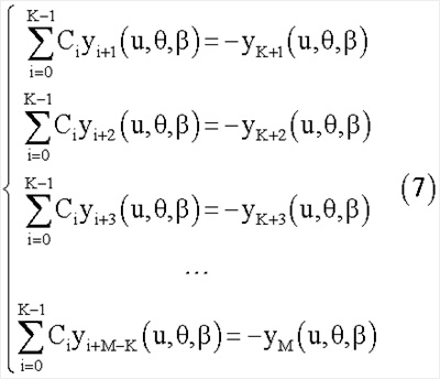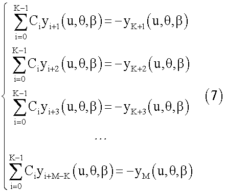 Данная система может быть переопределена, если зарегистрированы значения yi, i>M, желательно до i=kM, k=2; 3; . Для задачи пеленгации каждое уравнение системы (4) – это запись сигнала с одного вибратора.