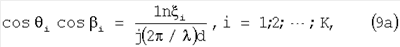 5. По формуле (9б) находят азимутальные пеленги источников радиоизлучения (если угломестные пеленги равны нулю) или (если угломестные пеленги не равны нулю) по формуле (9а) находят величины произведений косинусов азимутальных и угломестных пеленгов, а затем по простым тригонометрическим формулам находят значения азимутальных и угломестных пеленгов, запоминают значения пеленгов.