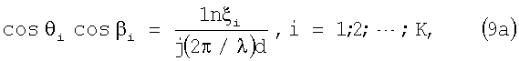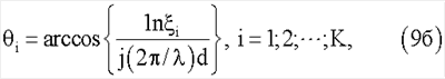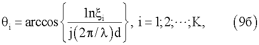 Для существенного упрощения решения задачи сведем определение пеленгов к определению показателей сумм экспоненциальных функций. Данный способ приводит к оценке пеленгов посредством решения алгебраических уравнений (квадратных, кубических, четвертой степени и т.д.) путем введения новых переменных i, i=1; 2; ; K. Если шаг задания этих переменных будет равномерным (что предпочтительнее), то получим полное алгебраическое уравнение (линейная AC), a если шаг для i будет неравномерным, то получим неполное алгебраическое уравнение или уравнение с дробными показателями (нелинейная АС). Корни полученного алгебраического уравнения – есть значения i.