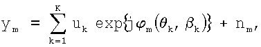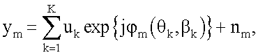 Полагаем, что в эфире присутствует K штук ИРИ с азимутальными пеленгами угломестными пеленгами и амплитудами (мощностями) излучаемых сигналов  – сигнал комплексного амплитудно-фазового распределения, описывающий амплитуды и фазы сигналов, принятых элементами АС, где М – количество элементов АС. Используемый вид модуляции (амплитудная, частотная, фазовая и др.) не имеет принципиального значения.