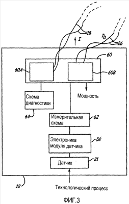 Фиг.3 – упрощенная структурная схема преобразователя 12. Как показано на фиг.3, преобразователь 12 включает в себя измерительную схему 62, которая присоединяется к датчику 21 технологического параметра. Измерительная схема 62 может быть включена в электронную схему 52 модуля датчика, показанную на фиг.2. Схема 60 присоединяется к измерительной схеме 62 и выполнена с возможностью отправки (и, в некоторых вариантах осуществления, приема) информации по контуру 18 управления технологическим процессом и необязательному контуру 26. Выходная схема 60 включает в себя выходную схему 60A первого контура и выходную схему 60B необязательного второго контура. Однако схемы 60A и 60B могут быть сконфигурированы в соответствии с другими вариантами осуществления. Измерительная схема 62 выполнена с возможностью обеспечения начальной обработки технологического параметра, считанного датчиком 21. Реализация измерительной схемы 62 часто включает в себя микропроцессор. Микропроцессор также может использоваться для реализации других схемных функциональных возможностей, показанных в устройстве.