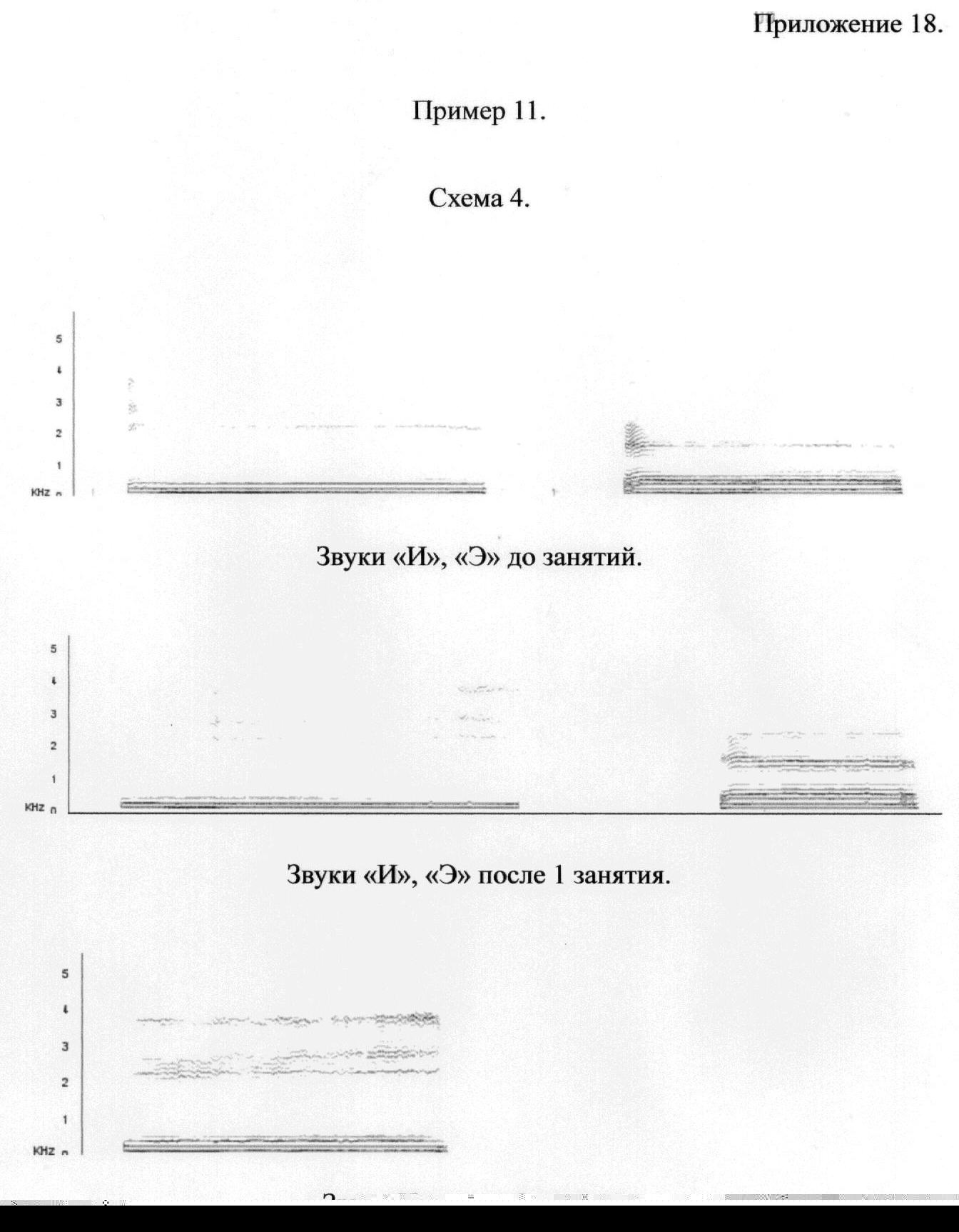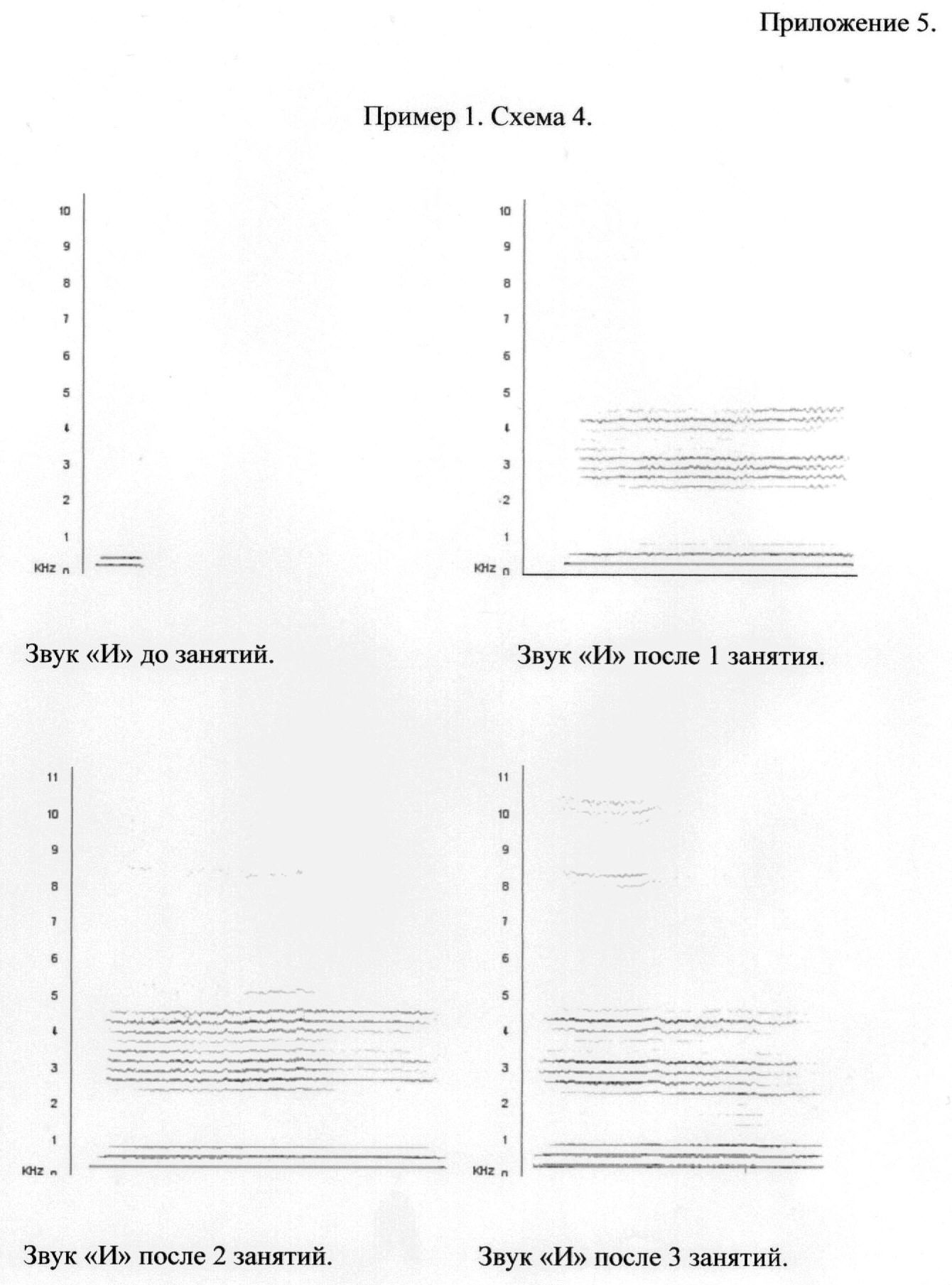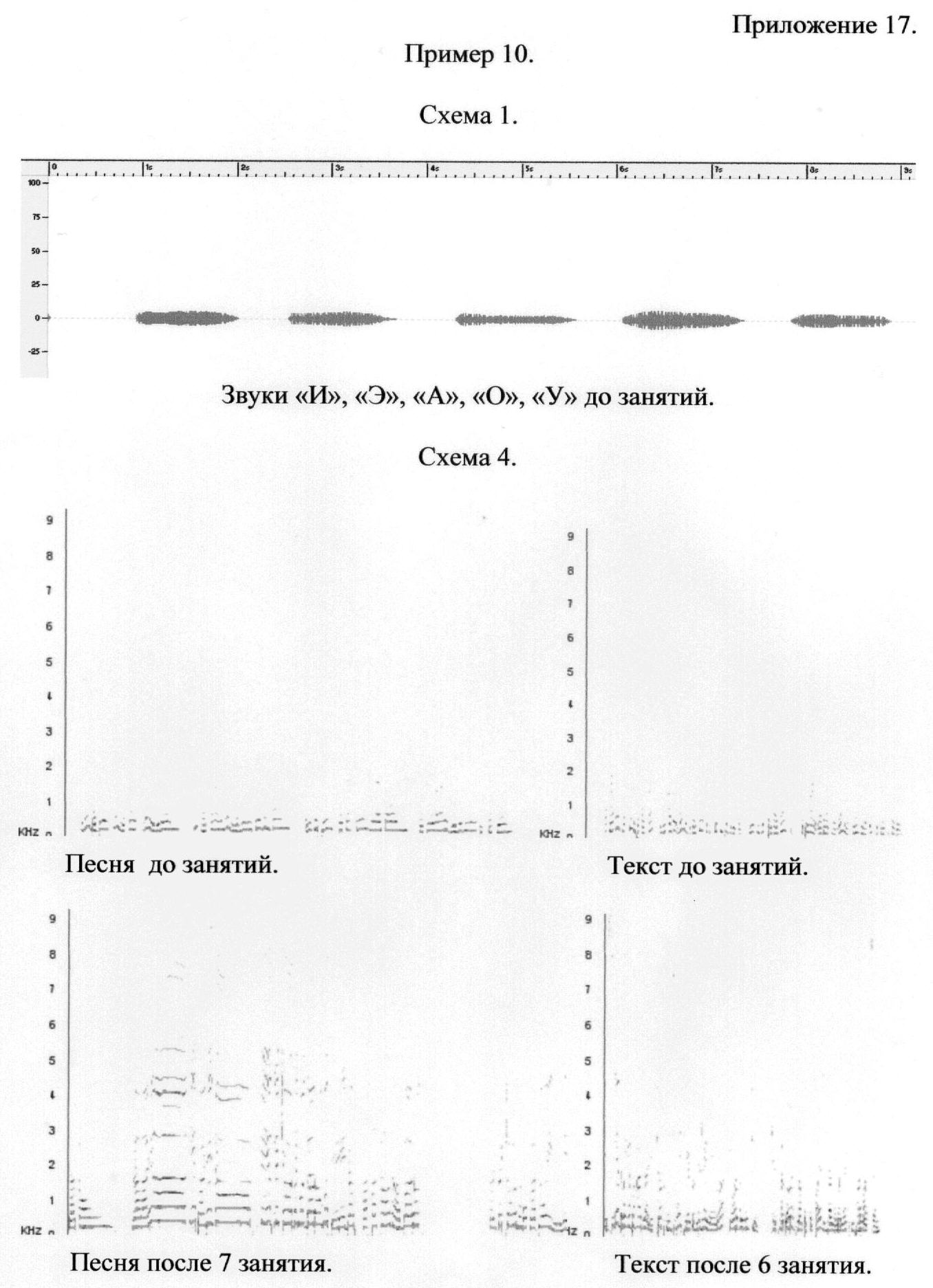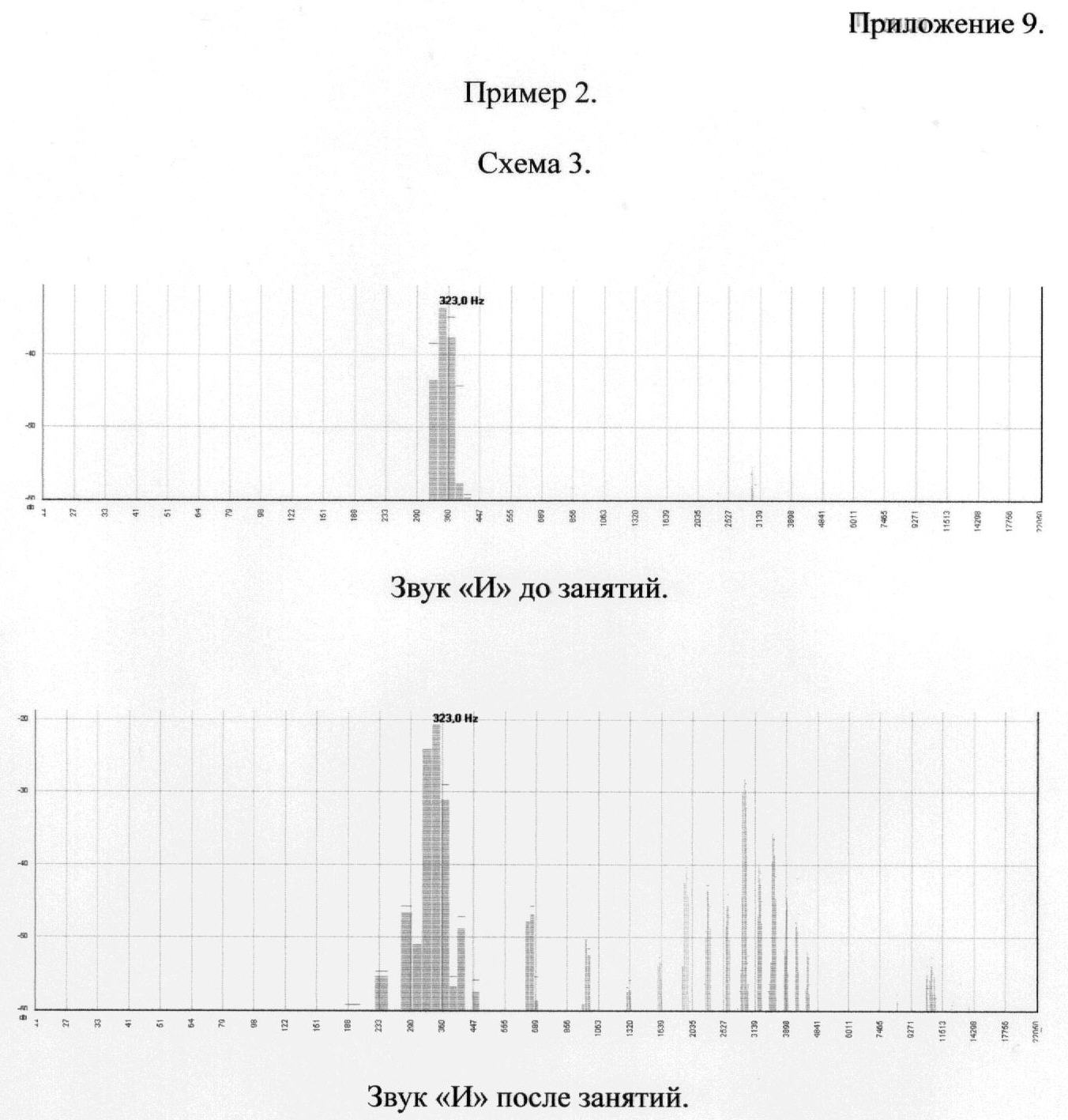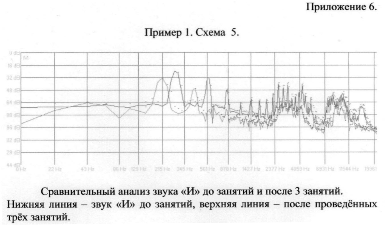 Схема 5. Сравнительный анализ звука «И» до занятий и после 3 занятий показал наличие «подъезда» к звуку – неточное вступление, что еще раз подтверждает имеющиеся проблемы с интонацией.