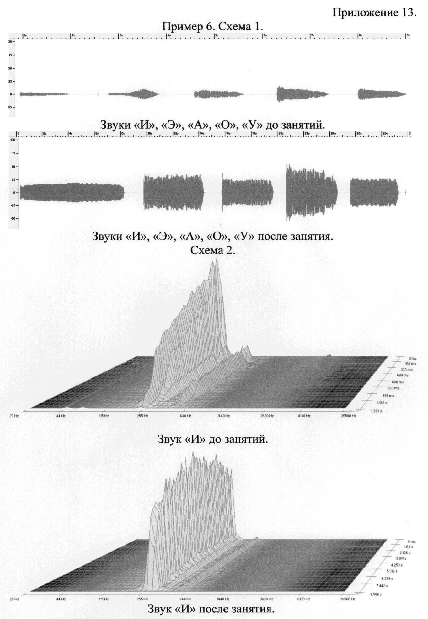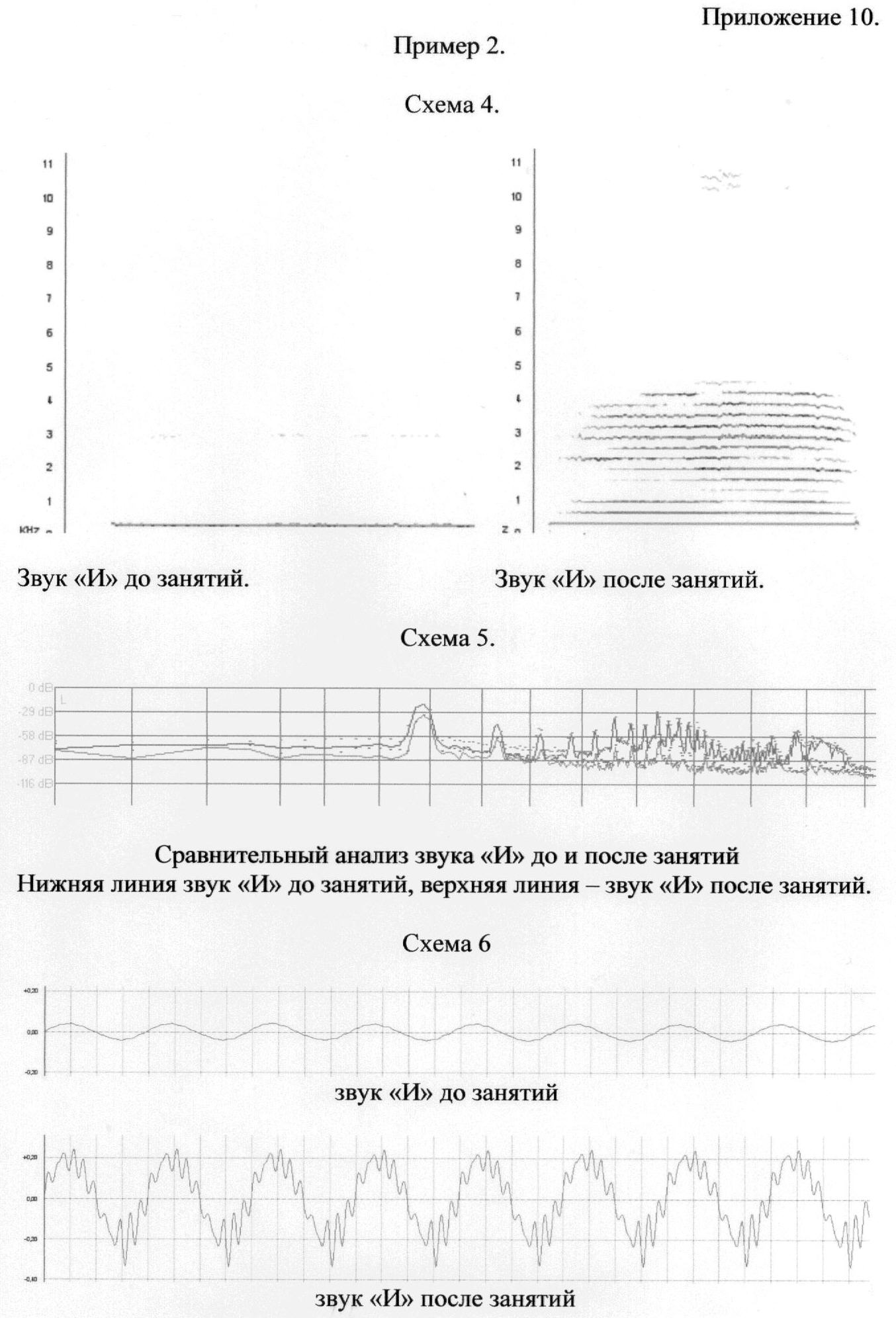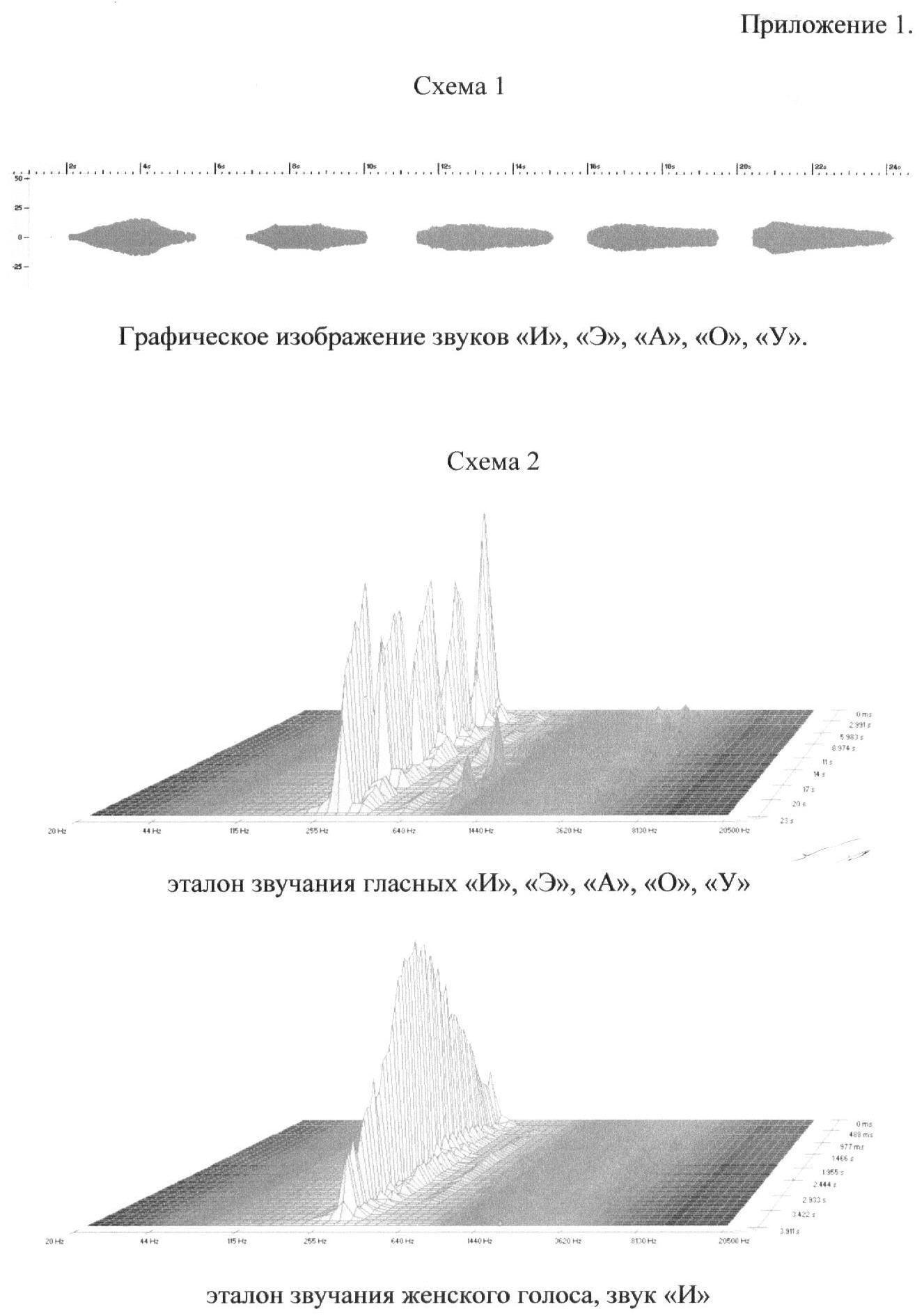 2. Способ обучения резонансной вокально-речевой технике на основе формирования резонансной акустики голосового аппарата, включающий этапы: речевой этап, состоящий из отработки сначала речи, а затем вокальный этап, постановку резонансных ощущений формирования согласных звуков, начиная с анализа согласного звука ЛЬ и близких к нему по типу звукоизвлечения согласных Н, Т, Д, выполнение комплекса упражнений, использование репертуара для детей и взрослых в виде видео/аудиокассет, отличающийся тем, что процесс обучения строится на основании результатов комплексного обследования голосовых данных по п.1 и делится на этапы: настройка голоса, подготовительный, коррекционный, координационный и речевой этапы, которые проводят в упомянутой последовательности, начиная с гласных звуков, причем настройку голоса осуществляют в процессе вокализации высокочастотного объемного звука И, затем полученные качества звучания тембра переносят на гласные И, Э, А, О, У, управляют обертонами в голосе с помощью плавного их перемещения от высокочастотного звука И с последующим постепенным заполнением всего спектра частот гласными Э, А, О, заканчивая низкочастотным У, и наоборот, от низкочастотного У до высокочастотного И, и далее с пропеванием последовательности гласных звуков У, О, А, Э, И, на подготовительном этапе уточняют положения внешней и внутренней артикуляций, соединяют головной и грудной регистры в микстовое звучание, выполняют упражнения для формирования ощущения опоры звука, на коррекционном этапе отрабатывают уровень владения фокусировкой звука и пользования резонаторными полостями с помощью подстройки голоса педагога к голосу обучаемого в режиме реального времени, выполняют вокально-речевые упражнения, осуществляют сеансы тренировки синусоидальной формы звукового сигнала для гласных звуков, проводят экспресс-настройку голоса и аэробику гласных, на координационном этапе путем выполнения дыхательных и вокально-речевых упражнений в режиме реального времени с использованием биологически обратной связи отрабатывают различные типы дыхания: поверхностный ключичный, грудной, верхнереберно и нижнереберно диафрагмальный, парадоксальный, брюшной, комбинированный, дополнительно проводят постановку дыхания типа диагональный, речевой этап осуществляют от вокала к речи по схеме: сначала беззвучно произносят гласные звуки, затем каждую гласную произносят отдельно с использованием резонансной техники: фокусировка звука, атака звука, звуковая волна, после этого гласные в словах, фразах и предложениях произносят без согласных, озвучивают глухие согласные и отрабатывают четкость их произнесения, соединяют гласные и согласные с помощью анализаторов звука, используют дидактический материал в виде видео/аудиозаписей из базы данных голосов певцов разных жанров и стилей, актеров, педагогов, бизнесменов, менеджеров, а также людей, имеющих нарушения голосовой функции, полученные в ходе различных заболеваний.