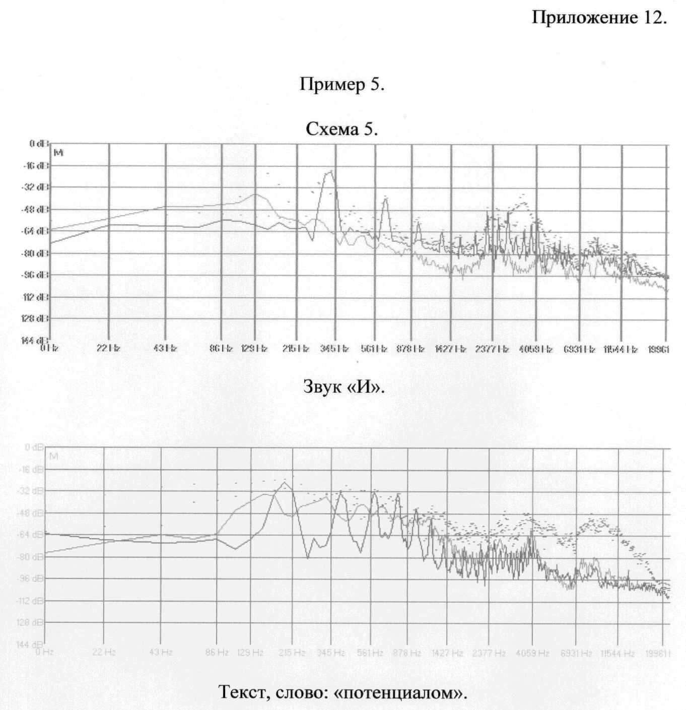 1. Способ определения голосовых данных, включающий измерение параметров высокой певческой форманты голоса посредством аппаратуры, измерения спектров вокальных гласных и параметров вибрато, определение относительного уровня высокой певческой форманты в каждом спектре и их сравнение, определение степени совпадения местоположения высоких певческой и речевой формант, отличающийся тем, что дополнительно осуществляют слуховую диагностику голоса, а измерения производят с помощью компьютерных программ обработки звукового сигнала в диапазоне частот до 20500 Гц и дополнительно проводят измерение параметров в трехмерном пространстве, анализ осуществляют на основе комплексной оценки объективных и субъективных показателей акустических характеристик голоса в пении и речи путем сравнения с эталоном звучания голоса, отражающим основные свойства звука: высоту, тембр, громкость, длительность, причем в качестве объективных показателей, дополняющих оценку тембральных характеристик, принимают основные качества звучания голоса: звонкость, объем и полетность.
