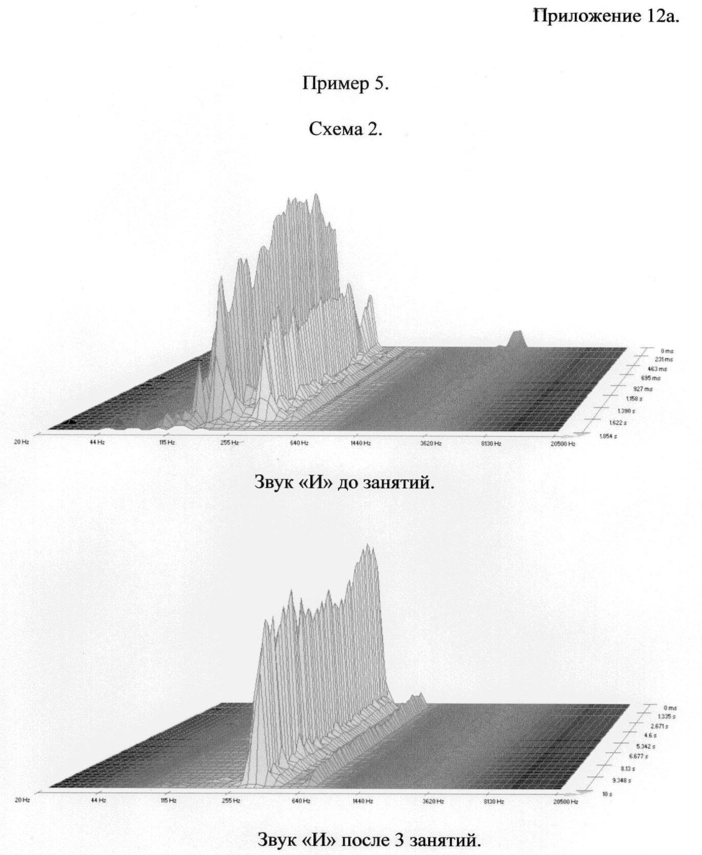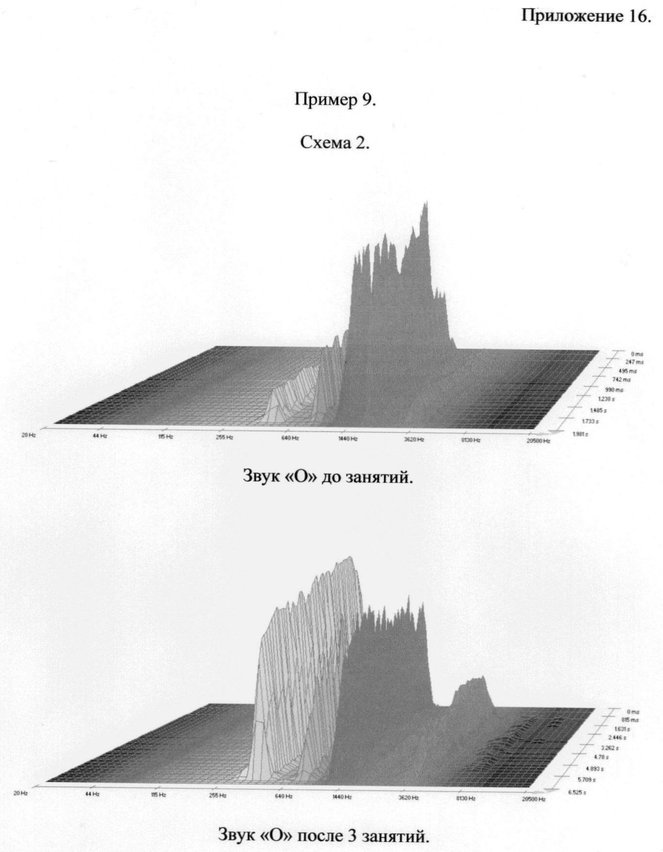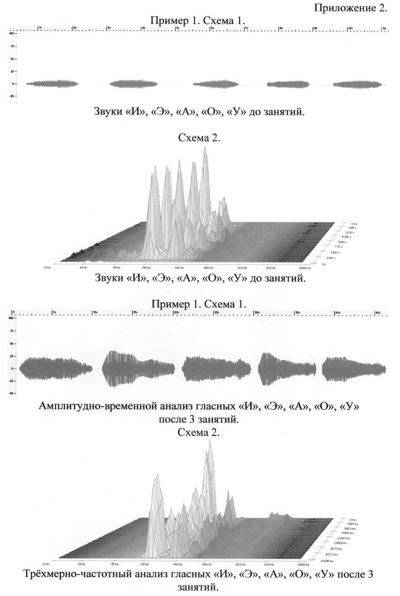 Поставленная задача решается за счет того, что при определении голосовых данных дополнительно проводят слуховую диагностику голоса и трехмерный спектральный анализ в диапазоне частот до 20500 Гц, измерения производят на компьютере с помощью компьютерных программ обработки звукового сигнала, анализ осуществляют на основе комплексной оценки объективных и субъективных показателей акустических характеристик голоса в пении и речи путем сравнения с эталоном звучания, причем субъективными показателями являются основные свойства звука: высота, тембр, громкость, длительность, а объективными показателями, дополняющими оценку тембральных характеристик, – основные качества звучания голоса: звонкость, объем, полетность, процесс обучения резонансно-вокальной речевой технике строят на основании результатов диагностического обследования и делят на этапы: настройка голоса, подготовительный, коррекционный, координационный и речевой этапы обучения проводят в строго определенной последовательности, начиная с гласных звуков, причем настройка голоса осуществляется в процессе вокализации высокочастотного объемного звука “И”, затем полученные качества звучания тембра переносят в строго определенном порядке на гласные “И”, “Э”, “А”, “О”, “У”, управляют обертонами в голосе с помощью плавного их перемещения от высокочастотного звука И с последующим постепенным заполнением всего спектра частот гласными “Э”, “А”, “О”, заканчивая низкочастотным “У”, и, наоборот, от низкочастотного У до высокочастотного И, и далее с пропеванием последовательности гласных звуков “У”, “О”, “А”, “Э”, “И”, на подготовительном этапе уточняют положения внешней и внутренней артикуляции, соединяют головной и грудной регистр в микстовое звучание, выполняют упражнения для формирования ощущения опоры звука, на коррекционном этапе отрабатывают уровень владения фокусировкой звука и пользования резонаторными полостями с помощью подстройки голоса педагога к голосу обучаемого в режиме реального времени, выполняют вокально-речевые упражнения, проводят сеансы тренировки волновой (синусоидальной) формы звукового сигнала, осуществляют экспресс-настройку голоса, проводят аэробику гласных, на координационном этапе путем выполнения дыхательных и вокально-речевых упражнений в режиме реального времени с использованием биологически обратной связи отрабатывают все типы дыхания (поверхностный ключичный, грудной, верхнереберно и нижнереберно-диафрагмальный, парадоксальный, брюшной, комбинированный), дополнительно проводят постановку дыхания типа диагональный, речевой этап осуществляют от вокала к речи по схеме: сначала беззвучно произносят гласные звуки, затем каждую гласную произносят отдельно с использованием резонансной техники: фокусировка звука, атака звука, звуковая волна, после этого гласные в словах произносят без согласных (протяжная речь), озвучивают глухие согласные и отрабатывают четкость их произнесения, осуществляют коррекцию голоса с помощью анализаторов звука, используют дидактический материал в виде видео/аудиозаписей из базы данных голосов певцов разных жанров и стилей, актеров, педагогов, бизнесменов, менеджеров, а также людей, имеющих нарушения голосовой функции, полученные в ходе различных заболеваний.