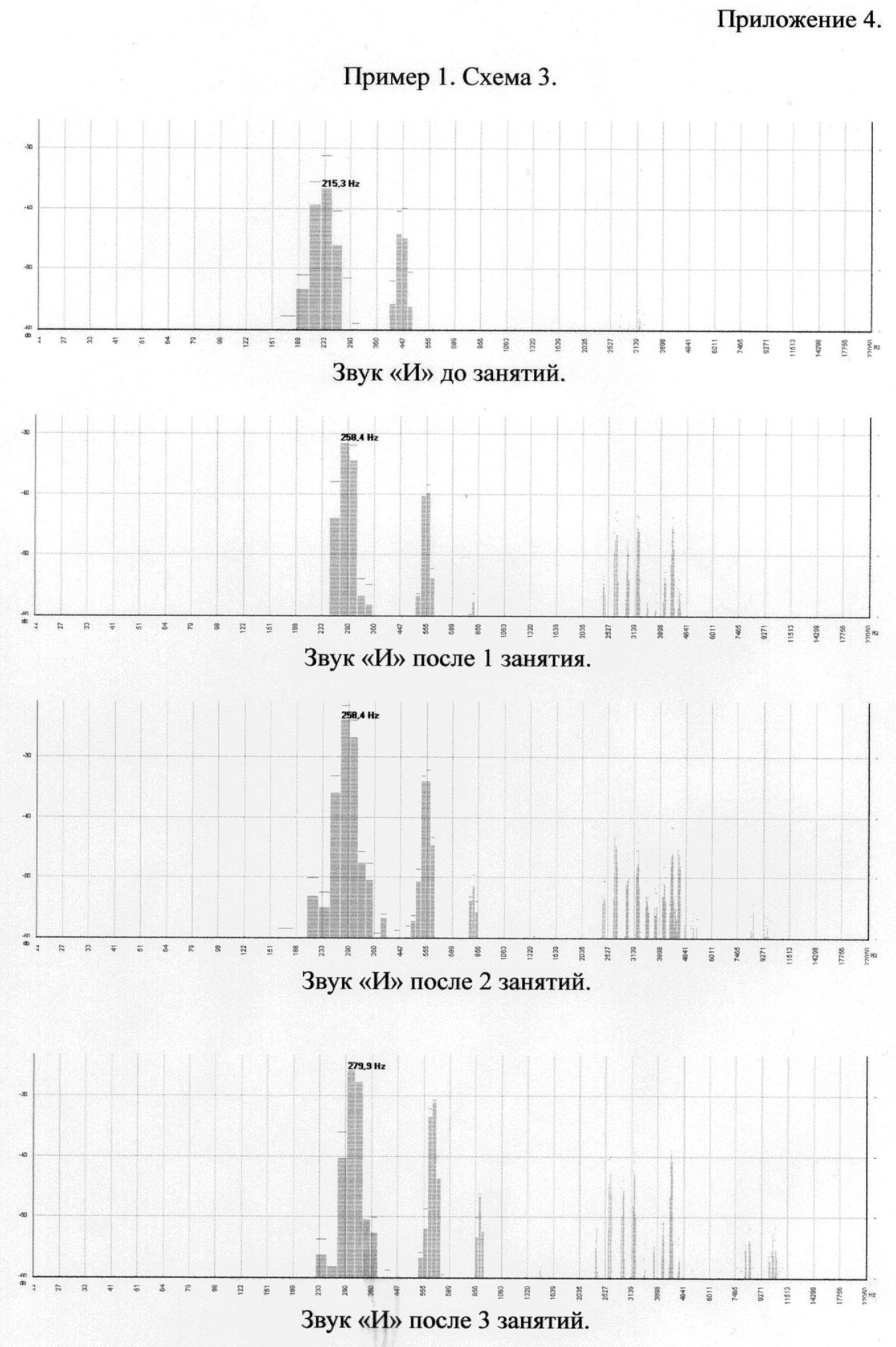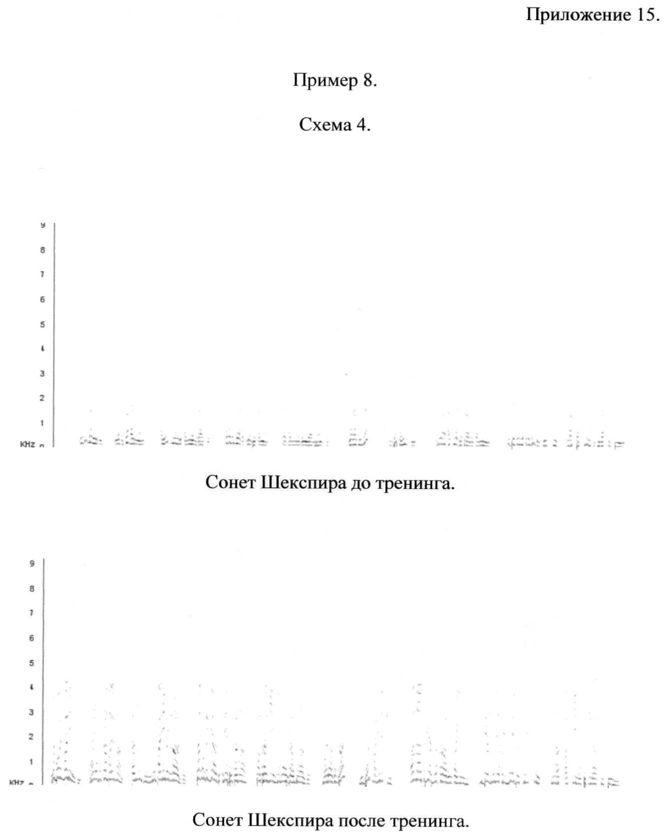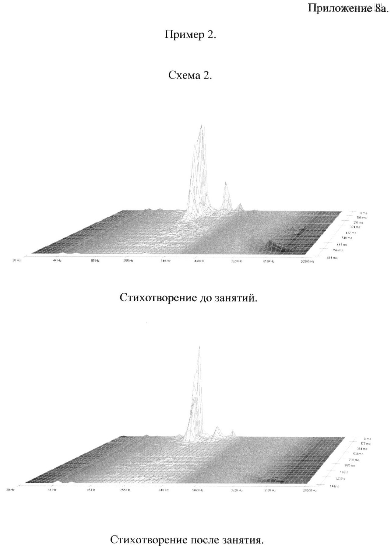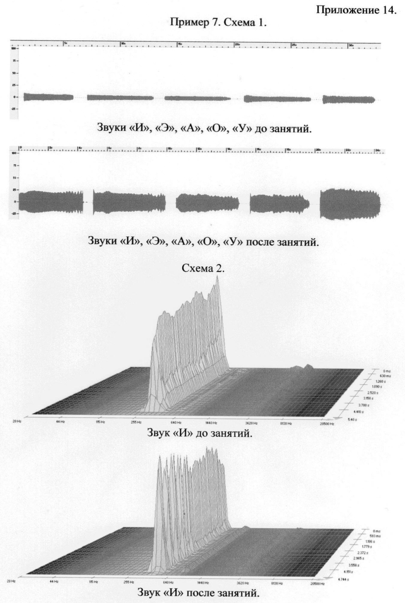Поставленная задача решается за счет того, что при определении голосовых данных дополнительно проводят слуховую диагностику голоса и трехмерный спектральный анализ в диапазоне частот до 20500 Гц, измерения производят на компьютере с помощью компьютерных программ обработки звукового сигнала, анализ осуществляют на основе комплексной оценки объективных и субъективных показателей акустических характеристик голоса в пении и речи путем сравнения с эталоном звучания, причем субъективными показателями являются основные свойства звука: высота, тембр, громкость, длительность, а объективными показателями, дополняющими оценку тембральных характеристик, – основные качества звучания голоса: звонкость, объем, полетность, процесс обучения резонансно-вокальной речевой технике строят на основании результатов диагностического обследования и делят на этапы: настройка голоса, подготовительный, коррекционный, координационный и речевой этапы обучения проводят в строго определенной последовательности, начиная с гласных звуков, причем настройка голоса осуществляется в процессе вокализации высокочастотного объемного звука “И”, затем полученные качества звучания тембра переносят в строго определенном порядке на гласные “И”, “Э”, “А”, “О”, “У”, управляют обертонами в голосе с помощью плавного их перемещения от высокочастотного звука И с последующим постепенным заполнением всего спектра частот гласными “Э”, “А”, “О”, заканчивая низкочастотным “У”, и, наоборот, от низкочастотного У до высокочастотного И, и далее с пропеванием последовательности гласных звуков “У”, “О”, “А”, “Э”, “И”, на подготовительном этапе уточняют положения внешней и внутренней артикуляции, соединяют головной и грудной регистр в микстовое звучание, выполняют упражнения для формирования ощущения опоры звука, на коррекционном этапе отрабатывают уровень владения фокусировкой звука и пользования резонаторными полостями с помощью подстройки голоса педагога к голосу обучаемого в режиме реального времени, выполняют вокально-речевые упражнения, проводят сеансы тренировки волновой (синусоидальной) формы звукового сигнала, осуществляют экспресс-настройку голоса, проводят аэробику гласных, на координационном этапе путем выполнения дыхательных и вокально-речевых упражнений в режиме реального времени с использованием биологически обратной связи отрабатывают все типы дыхания (поверхностный ключичный, грудной, верхнереберно и нижнереберно-диафрагмальный, парадоксальный, брюшной, комбинированный), дополнительно проводят постановку дыхания типа диагональный, речевой этап осуществляют от вокала к речи по схеме: сначала беззвучно произносят гласные звуки, затем каждую гласную произносят отдельно с использованием резонансной техники: фокусировка звука, атака звука, звуковая волна, после этого гласные в словах произносят без согласных (протяжная речь), озвучивают глухие согласные и отрабатывают четкость их произнесения, осуществляют коррекцию голоса с помощью анализаторов звука, используют дидактический материал в виде видео/аудиозаписей из базы данных голосов певцов разных жанров и стилей, актеров, педагогов, бизнесменов, менеджеров, а также людей, имеющих нарушения голосовой функции, полученные в ходе различных заболеваний.