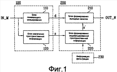 Ссылаясь на фиг.1, устройство 100 кодирования аудиосигнала (далее сокращенно устройство кодирования) включает в себя блок 110 понижающего микширования и блок 120 извлечения пространственной информации. Помимо этого, устройство 200 декодирования аудиосигнала (далее сокращенно устройство декодирования) включает в себя блок 210 формирования выходного сигнала и блок 220 формирования модифицированной пространственной информации.