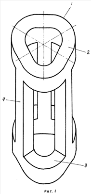 На фиг.1 схематически изображен предложенный магнитопровод с верхним и нижнем ярмами и стержнями, на фиг.2 – то же, вид сбоку и сверху, а на фиг.3 представлена аксонометрия магнитопровода. Сечения ярм и стержней показаны штриховыми линиями.