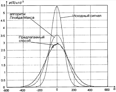 Известен также способ (S.P.Lloyd. “Least Squares Quantization in PCM.” IEEE Transactions on Information Theory. Vol IT-28, March 1982, 129-137), в котором для получения максимального отношения сигнал/шум при заданном количестве уровней квантования используют изменение шага квантования сигнала к оптимальному с точки зрения отношения сигнал/шум значению или при фиксированном шаге квантования производят масштабирование сигнала к оптимальному значению (что по сути одно и тоже). Для каждого вида сигнала оптимальный шаг квантования выбирается индивидуально.