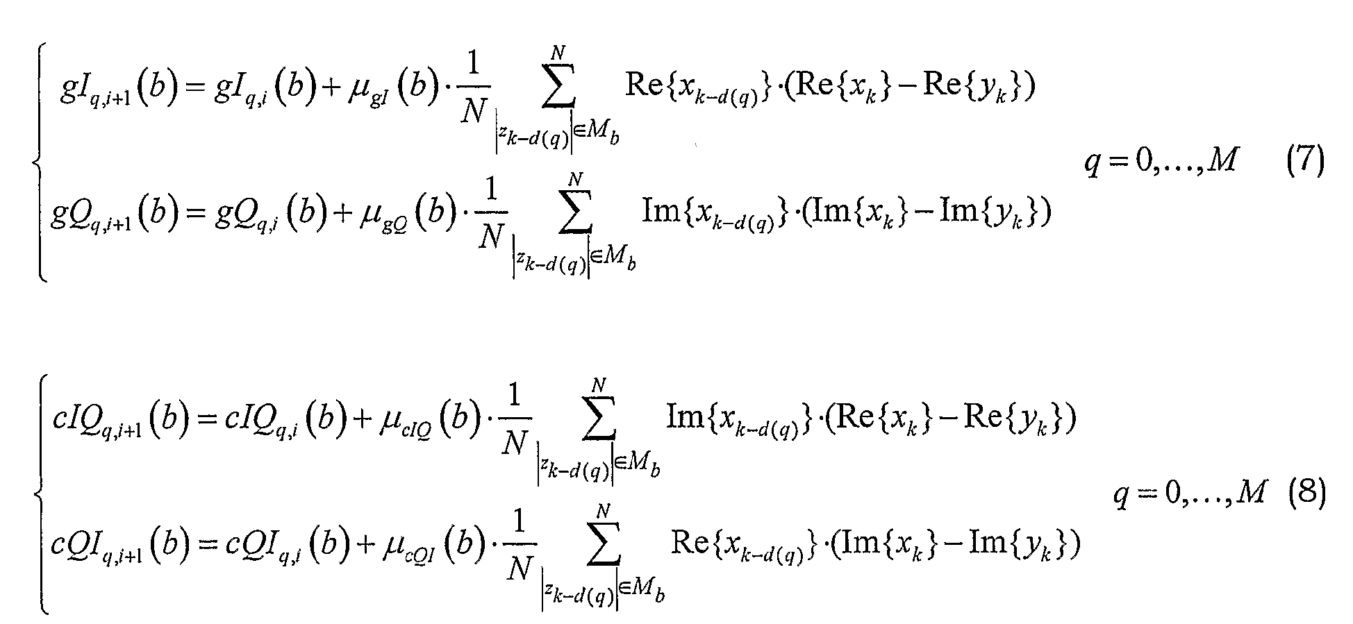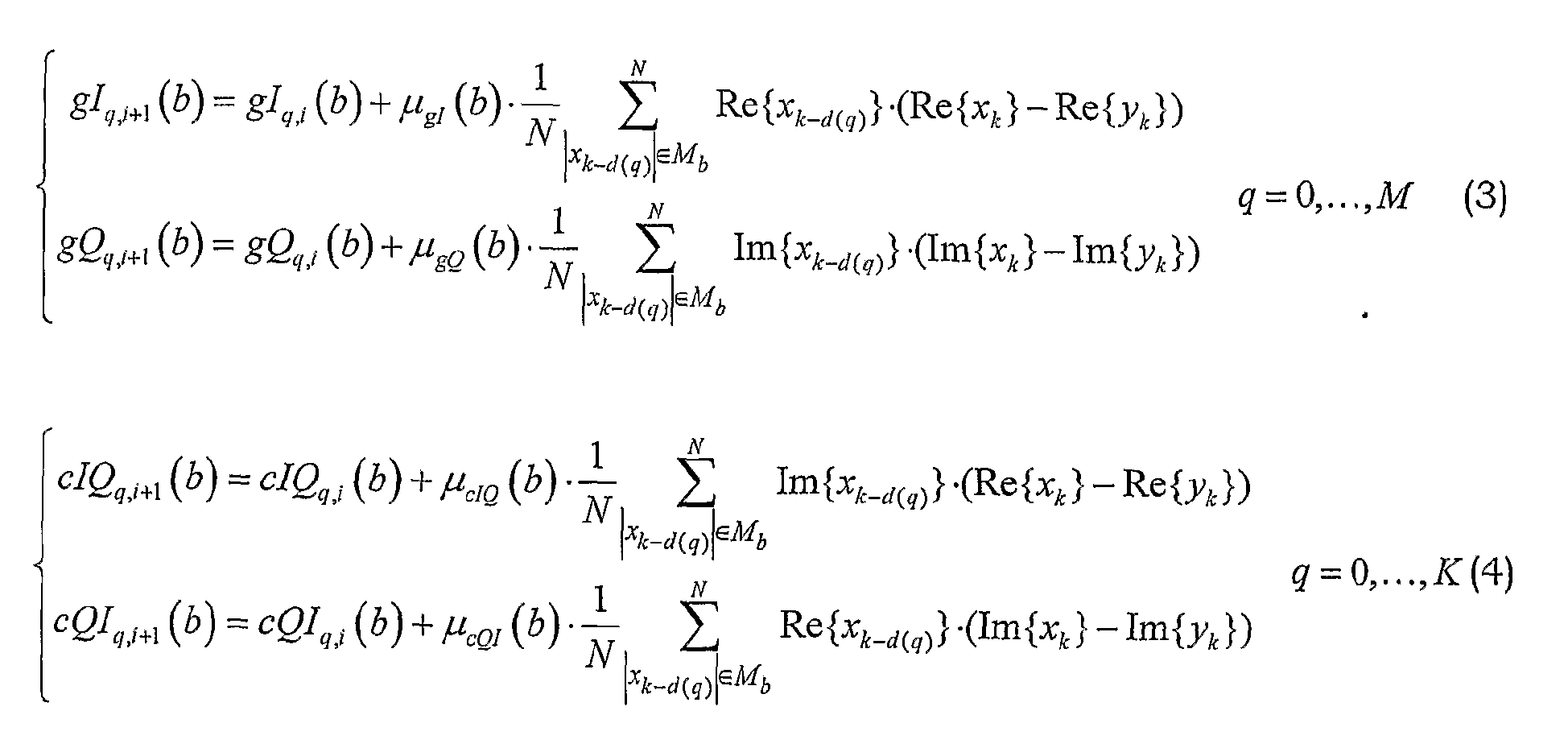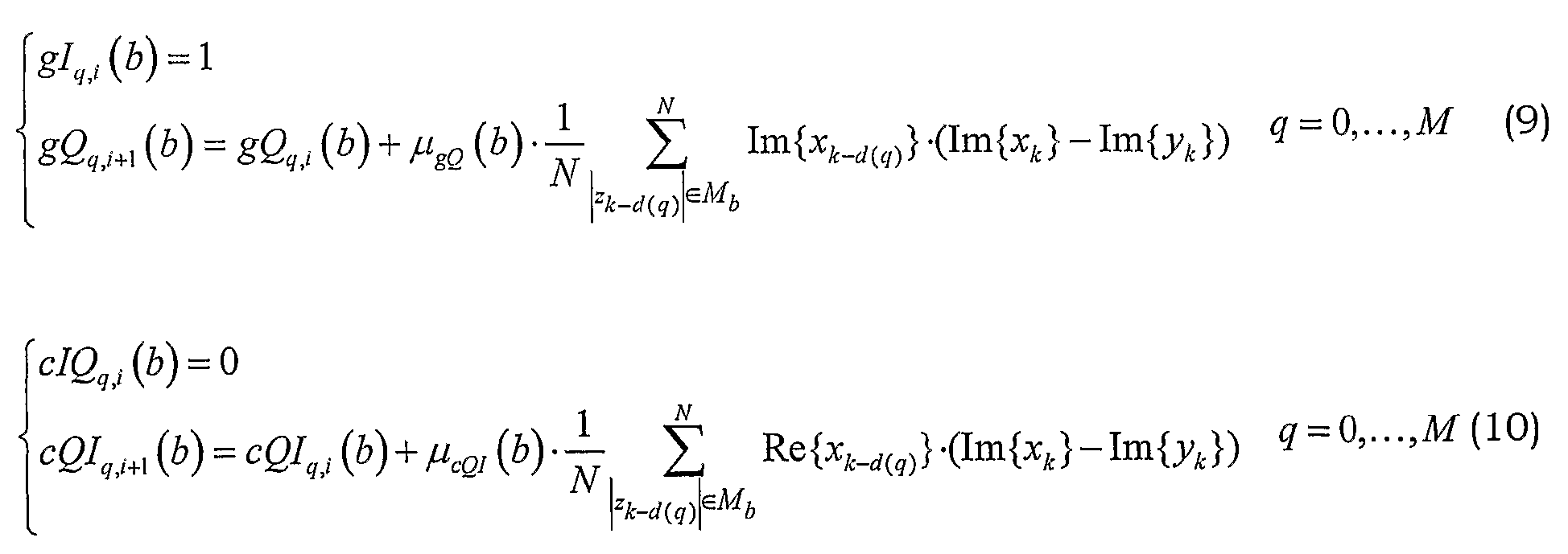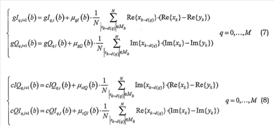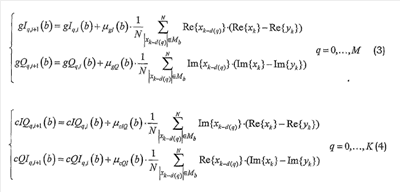 В уравнениях (3)-(4) используется различное количество (M+l and K+1 соответственно) отводов фильтров. Тем не менее, возможно использовать одинаковое количество отводов фильтра для gIQ, gQq и gIQq, gQIq. Более того, также возможно использовать различные интервалы Mb для двух случаев. Упрощение может быть получено посредством допущения, что каждая (или по меньшей мере одна) из постоянных контура не зависит от элемента b.