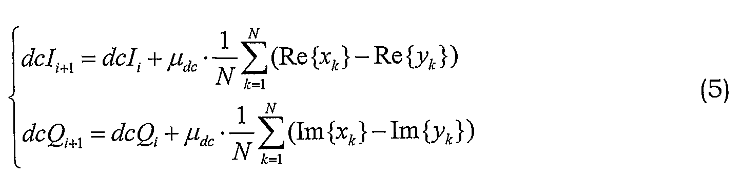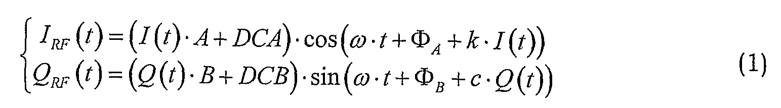 Здесь уравнение (3) представляет отводы фильтров gIQ, gQq для фильтрации компонент I и Q для компенсации амплитудных погрешностей, создаваемых IQ-модулятором без учета интермодуляционной погрешности. Интермодуляция обрабатывается отводами фильтров gIQq, gQIq в уравнении (4), а ошибки смещения обрабатываются посредством dcI, dcQ в уравнении (5).