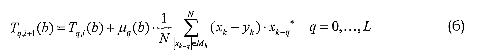 В одном варианте осуществления блок 34 обучения может обновлять различные отводы фильтров в соответствии с уравнениями (3)-(6). Однако обнаружено, что объединенный контур управления, показанный на фиг.6, работает даже лучше, если уравнения (3)-(4) несколько изменены и представлены в виде:
