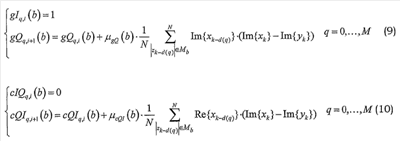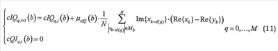 Как показано ниже, погрешности IQ-модулятора могут быть нейтрализованы при помощи цифрового предыскажения IQ-сигнала в базовой полосе с использованием итеративно обновляемых структур фильтров, в которых отводы фильтров зависят от величин компонент I и Q. Эти структуры фильтров могут, например, обновляться в соответствии с алгоритмом минимальных среднеквадратичных отклонений, как: