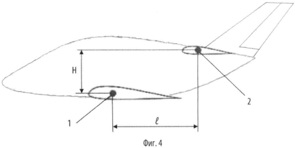 Площадь переднего крыла 1 больше площади заднего крыла 2, которое расположено относительно переднего крыла 1 таким образом, что уменьшает перетекание воздуха через заднюю кромку переднего крыла 1. Кроме того, геометрические параметры заднего крыла 2 выбраны так, чтобы получить на нем больший прирост подъемной силы по углу атаки, чем на переднем крыле 1.