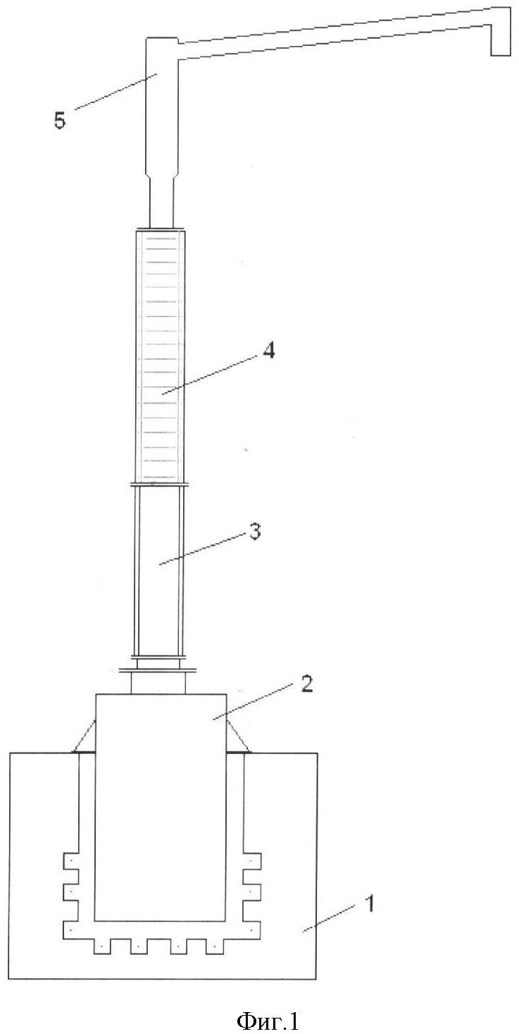Существующая промышленная ректификационная установка очистки пентахлорида ниобия представлена на фиг.1, состоящая из электропечи (1), куба-испарителя (2) из нержавеющей стали, эмалированной царги (3), кварцевой колонны (4), Г-образного дефлегматора (5). Конструкция установки позволяет отделять TaCl5 в головной фракции до уровня содержания тантала 0,025%. После отделения головных фракций осуществляется отбор основных фракций чистого NbCl5. Основная фракция по данным атомно-эмиссионного анализа содержит следующие количества примесей, мас.%, не более: