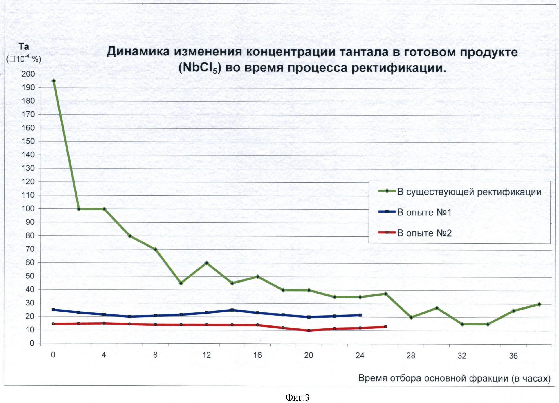 Динамика изменения концентрации тантала в чистом пентахлориде ниобия представлена на фиг.3.