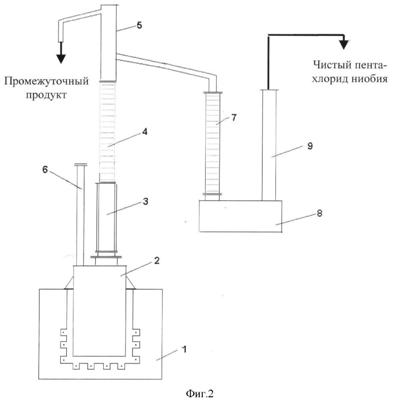 Устройство для непрерывной очистки пентахлорида ниобия (фиг.2) состоит из электропечи (1), куба-испарителя (2) из нержавеющей стали, снабженного узлом для непрерывной загрузки исходного сырья (6), эмалированной царги (3), кварцевой колонны (4), Г-образного дефлегматора, снабженного разделителем флегмы (5), к которому присоединена вторая кварцевая ректификационная колонна (7) с обогреваемым кубом-испарителем (8) из кварцевого стекла, снабженным узлом отбора чистого пентахлорида ниобия (9).