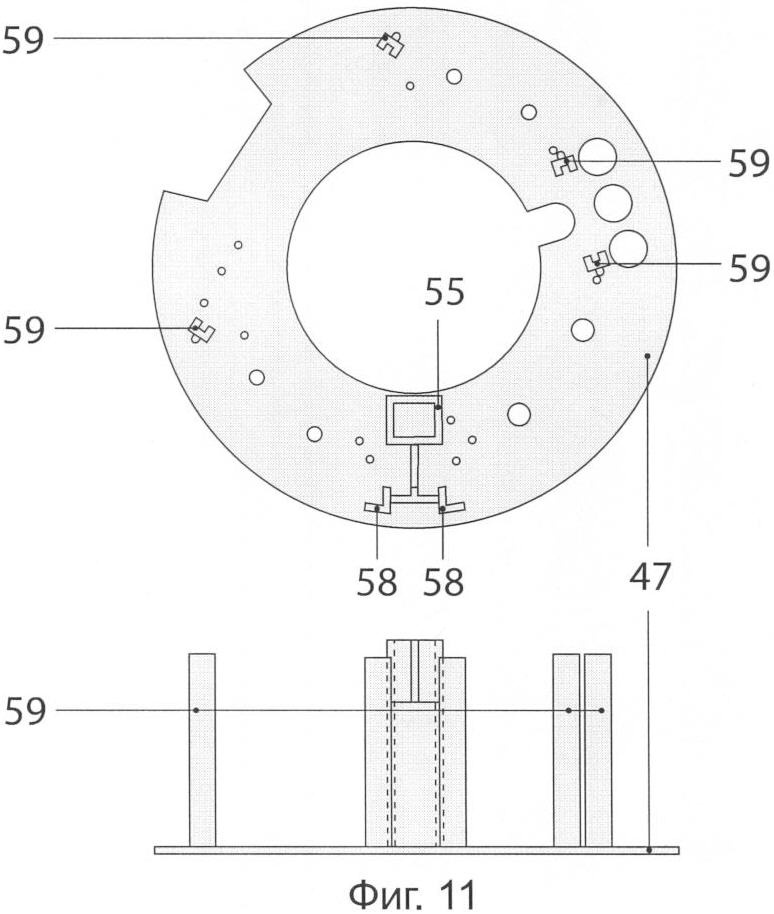 Гросс-плата 47 расположена внизу внутри корпуса устройства. На плате размещены и закреплены следующие компоненты устройства: воздушная помпа с электромотором – компрессор 48, плата звуковых эффектов 49, контакты 50 батарей, выключатель 51, плата световых эффектов 52, фоторезистор 53, светодиоды 54. Также на гросс-плате сформирован колодец 55 для магнита 56 гравитационного выключателя. Донышко колодца выполнено на уровне основания гросс-платы. С верху колодец закрывается кусочком поролона или полипропилена, который обеспечивает необходимое расстояние до геркона 57 и амортизирует удары магнита о геркон. Геркон расположен над колодцем 55 в U-образном углублении. Опора 58 выключателя 51 сформирована как элемент платы и расположена перед колодцем гравитационного выключателя. Контакты 50 батарей крепятся на плате. Направляющие 59 для фиксации платы блока световых эффектов и платы блока звуковых эффектов сформированы как элементы гросс-платы. Блок световых эффектов имеет в своем составе светодиоды и фоторезистор, под которые в гросс-плате предусмотрены отверстия, а также плату световых эффектов с командным процессором. Плата звуковых эффектов содержит ППЗУ, звуковой синтезатор, усилитель низкой частоты и динамик 60. Под динамик в гросс-плате предусмотрен вырез. Помпа и электромотор компрессора для уменьшения вибрации обмотаны прокладкой 61. Электропитание устройства обеспечивают два независимых блока 62 стандартных батареек.