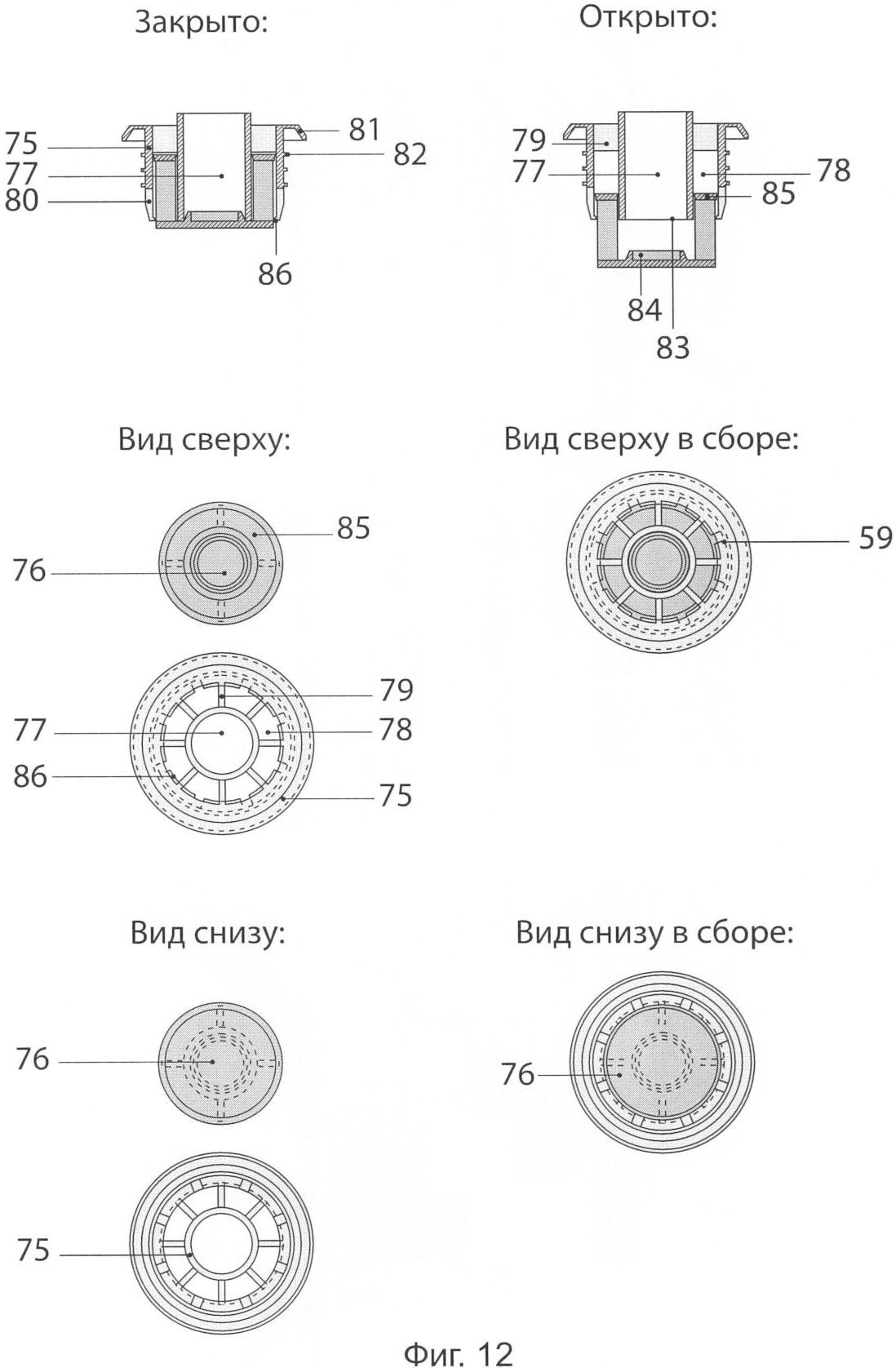 В данном варианте реализации устройства может быть также использовано автоматическое пневматическое запорное приспособление конструкции, показанной на фиг.12. Оно состоит из герметизирующего элемента 75 и клапана 76. Герметизирующий элемент может иметь конфигурацию двухстенного цилиндра с центральным отверстием 77 и продольным цилиндрическим воздушным каналом 78 для подачи воздуха в бутылку, образованным стенками внешнего и внутреннего цилиндров элемента, соединенными ребрами 79. В нижней части боковой образующей внешнего цилиндра элемента имеются прорези 80 для воздуха. В верхней части элемента сформировано место 81 для посадки на торец горлышка бутылки 67, на внешней поверхности цилиндрической части элемента сформированы уплотнительные пояски 82 для обеспечения герметического сопряжения с внутренней поверхностью горлышка бутылки. В нижней части центрального отверстия герметизирующий элемент имеет посадочное место 83 для обеспечения герметичного соединения с центральной частью (пробкой) 84 клапана 76.