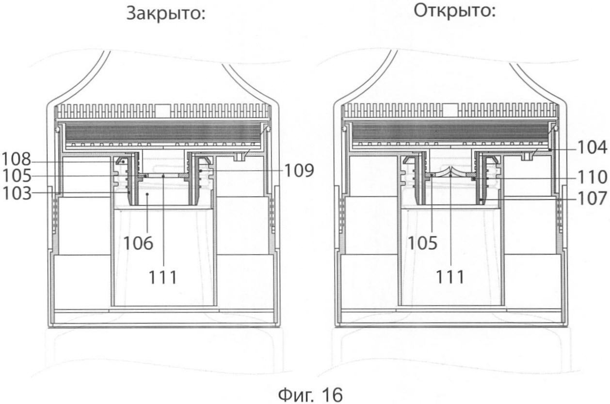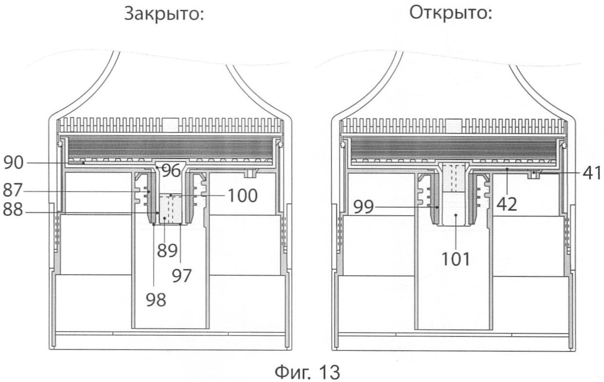 В положении открыто поршень удерживается в картридже силами упругости, при этом его головка 100 находится в зоне расширения нижнего цилиндра картриджа и не препятствует прохождению жидкости из емкости в полость картриджа через отверстие 101. Воздух от компрессора во внутреннюю полость бутылки при открытом клапане проходит через отверстие 41, воздушный канал 42, воздушные каналы 99 герметизирующего элемента и разрезы 93 в его внешней стенке. Жидкость из бутылки выливается через центральное отверстие 101 в нижнем элементе картриджа.