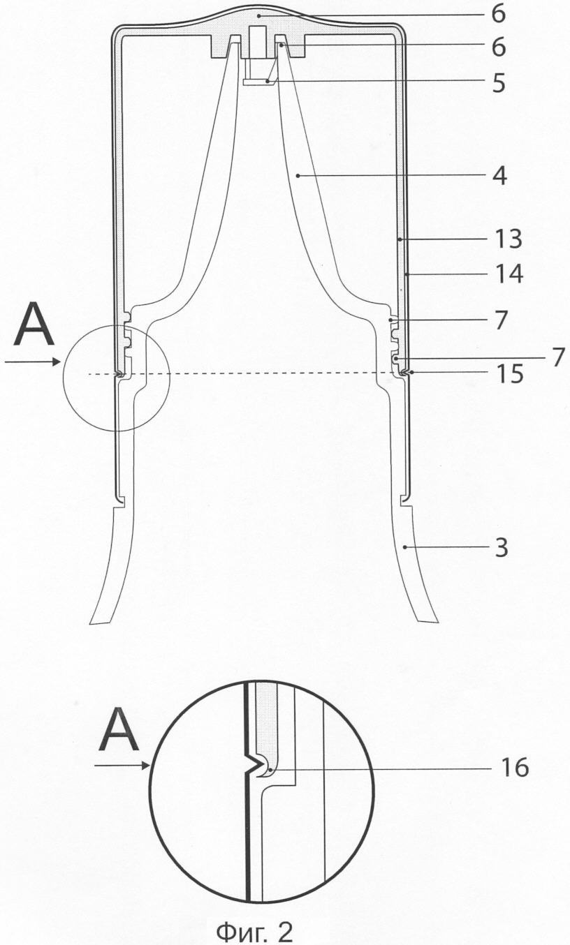 Горловина 3 из прозрачного материала имеет следующую конфигурацию: в верхней части сформировано узкое горлышко с соском 4, имеющим рассекатель-ограничитель 5 выливаемой жидкости, а также посадочное место для обеспечения герметичной укупорки всего изделия элементами 6 запорного колпачка; ниже соска на горлышке сформирована двухзаходная резьба 7 для соединения горловины с запорным колпачком; в нижней широкой части горловины на внутренней поверхности сформирована резьба 8 с запорной вертикальной прорезью 9 для соединения горловины с корпусом 10, а на внешней поверхности сформировано посадочное место 11 для поворотного кольца 12. Запорный колпачок двухкомпонентный и состоит из внутренней пластмассовой части 13 и внешней декоративной металлической части 14. Колпачок крепится на горловине посредством двухзаходной резьбы с последующей завальцовкой нижней части декоративного колпачка на горловину и завальцовкой с подрезкой по линии 15. Индикатором первого вскрытия служит нижняя кромка 16 внутреннего пластмассового колпачка, которая после первого вскрытия выступает в разрез внешнего колпачка и при следующих закрутках не устраняется. Повторная укупорка устройства осуществляется навинчиванием съемной части колпачка на горловину до упора с целью гарантированной герметичности укупорки, для этого на внутренней боковой поверхности пластмассового колпачка сформирована резьба 7. На внутренней поверхности в центре пластмассовой части 13 колпачка сформировано посадочное место 6 для обеспечения надежного герметичного соединения с соском горловины.