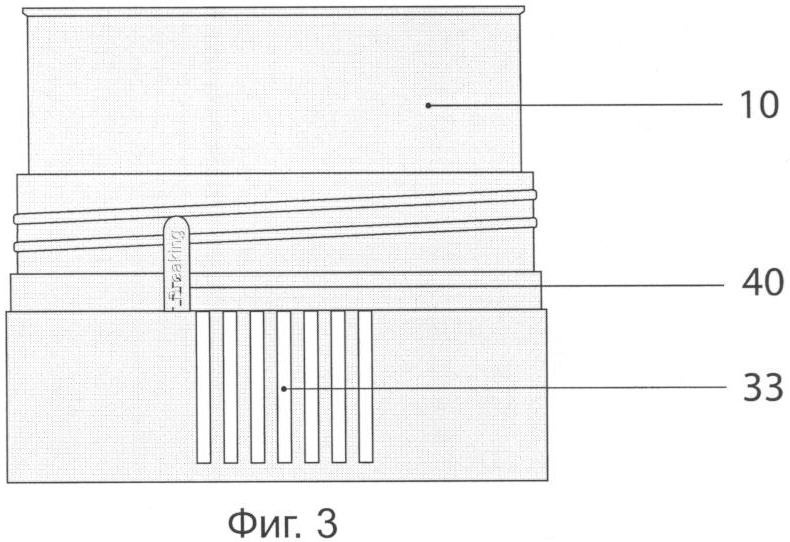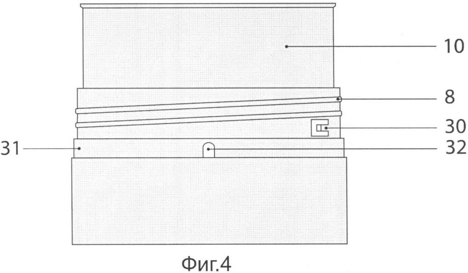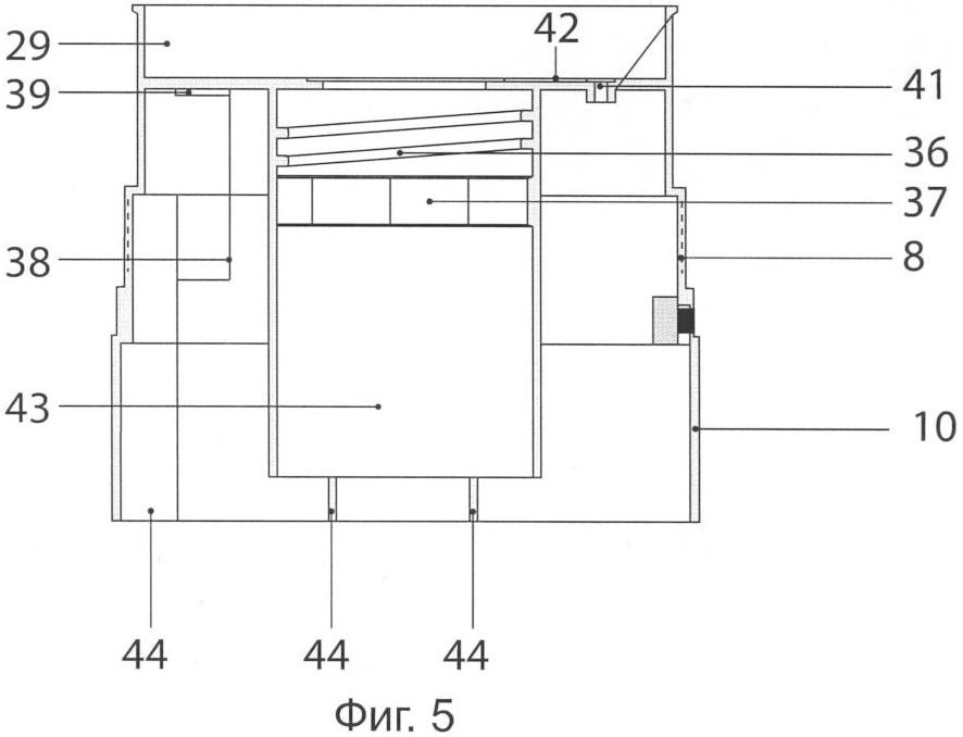 Корпус 10 устройства изготавливается из твердого материала. В верхней части корпуса образовано посадочное место 29 для картриджа. На внешней боковой поверхности в средней части сформирована резьба 8 и запорная защелка 30 для фиксации горловины от отвинчивания, посадочное место 31 для поворотного кольца 12, сквозное отверстие 32 для кнопки электрического включателя, сквозные вертикальные прорези 33 для прохода звука и ограничители угла поворота 34 поворотного кольца. Посадочное место для поворотного кольца с ограничителями угла поворота обеспечивает его свободное смещение в пределах, необходимых для включения и выключения устройства. На нижнюю часть корпуса может быть надето декоративное кольцо 35 из металла, в котором сделаны горизонтальные просечки для прохода звука. На внутренней поверхности внутренней цилиндрической части корпуса 10 сформирована резьба 36 и запорная зубчатка 37 для его соединения с горлышком бутылки. Запор от раскручивания осуществляется с помощью приливов на венчике бутылки и зубчатки 37. Во внутреннем пространстве корпуса между стенками внешнего и центрального цилиндра расположены батарейные отсеки 38 с пружинными перемычками 39. На внешней боковой стороне корпуса в зоне поворотного кольца сформирован отрывной элемент 40, индикатор первого включения, ломающийся при первом включении устройства потребителем. В предложенном варианте ломающийся элемент при надевании поворотного кольца на корпус устройства частично размещается в прорези поворотного кольца, а верхняя его часть наползает на поворотное кольцо с внешней его стороны. В верхней торцевой стенке корпуса организовано сквозное отверстие 41 с посадочным местом для соединения с выходным штуцером воздушной помпы, а на внешней торцевой поверхности со стороны картриджа отформован радиальный канал 42 для подачи воздуха в бутылку. Канал 42 соединяет вертикальное сквозное отверстие для помпы с центральным отверстием 43 во внутреннем цилиндре корпуса 10. Корпус 10 может быть выполнен с ребрами жесткости 44.