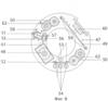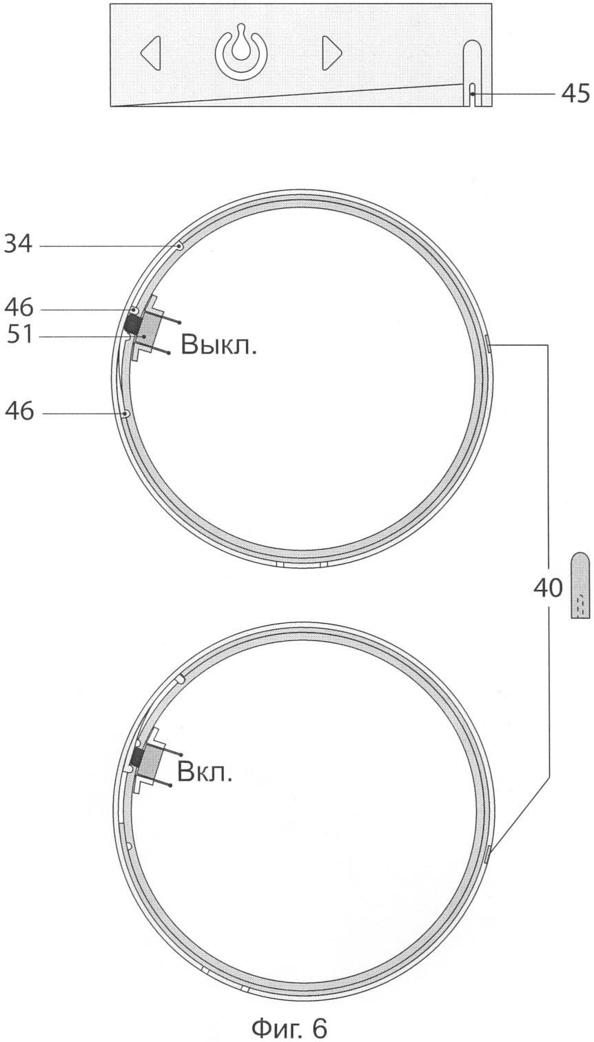 Поворотное кольцо свободно надевается на верхнюю часть корпуса. На лицевой стороне кольца показаны направления включения и выключения устройства. В нижней части поворотного кольца сделана прорезь 45, за счет которой при первом включении устройства (повороте кольца) ломается отрывной элемент, индикатор первого включения на корпусе. С внутренней стороны поворотного кольца сформированы соответствующие выступы 46, позволяющие при его поворотах производить нажатие на выключатель и осуществлять его фиксацию в положениях «включено» и «выключено». Поворотное кольцо 12 может состоять из двух частей: внешней декоративной части и внутренней технологической.