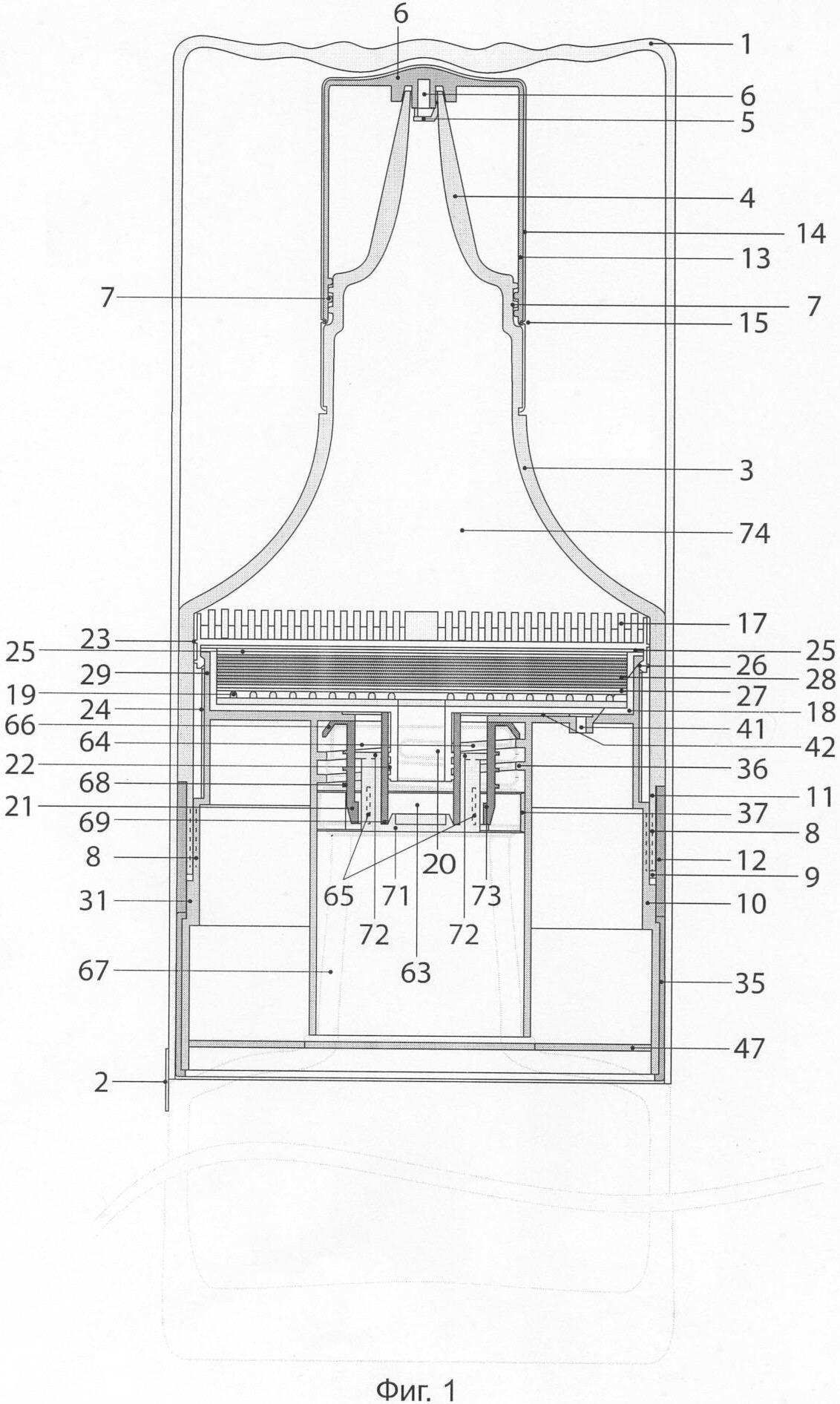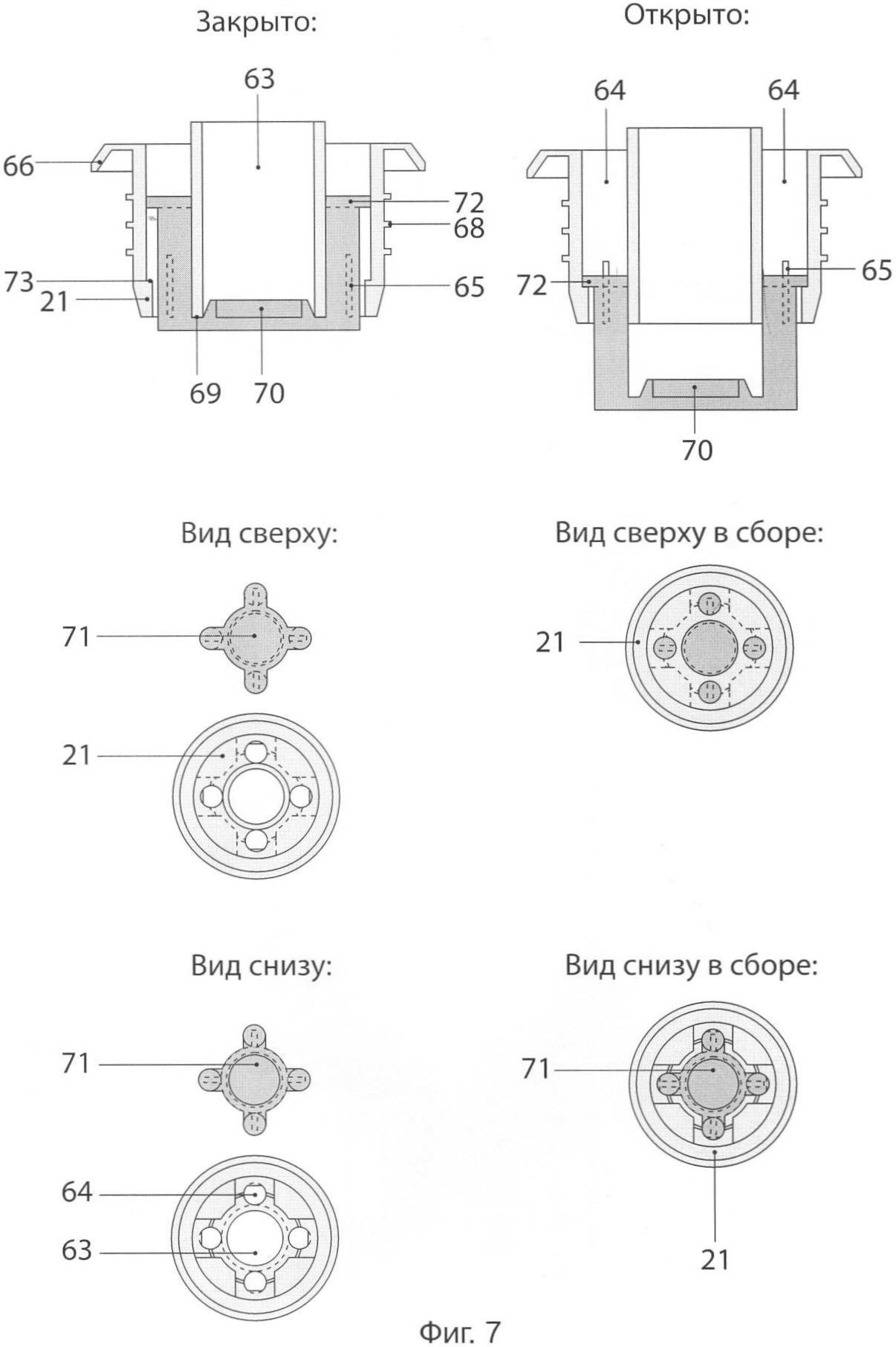 Герметизирующий элемент 21 с центральным отверстием 63 предназначен для обеспечения герметичности между горлышком бутылки, корпусом устройства и картриджем, а также для подачи воздуха под давлением от компрессора во внутреннюю емкость бутылки, а также в сборе с клапаном образует автоматическое пневматическое запорное приспособление. Герметизирующий элемент может иметь конфигурацию цилиндра с центральным отверстием 63 и продольными воздушными каналами 64 для подачи воздуха в бутылку, сформированными внутри его боковой образующей. В нижней части, обращенной внутрь емкости, воздушные каналы имеют прорези 65 для воздуха. В верхней части элемента сформировано место 66 для посадки на торец горлышка бутылки 67, на внешней поверхности цилиндрической части элемента сформированы уплотнительные пояски 68 для обеспечения герметического сопряжения с внутренней поверхностью горлышка бутылки. В нижней части центрального отверстия герметизирующий элемент имеет посадочное место 69 для обеспечения герметичного соединения с центральной частью (пробкой) 70 клапана 71.