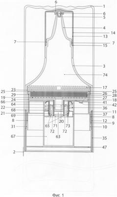 На фиг.1 схематично показано устройство для обработки и очистки жидкости, находящейся в бутылке; на фиг.2 – горловина с колпачком; на фиг.3 – корпус с прорезями для прохождения звука; на фиг.4 – корпус с запорной защелкой и отверстием для выключателя; на фиг.5 – корпус в разрезе; на фиг.6 – блок управления; на фиг.7 – два положения клапана с несколькими поршнями и его элементов относительно герметизирующего элемента; на фиг.8 – расположение различных блоков на гросс-плате внутри корпуса; на фиг.9 – электрические схемы блоков звуковых и световых эффектов и блока управления; на фиг.10 – дисковая решетка; на фиг.11 показана гросс-плата; на фиг.12 – два положения клапана с кольцевым поршнем и его элементов относительно герметизирующего элемента; на фиг.13 показан второй вариант выполнения клапана в двух положениях; на фиг.14 – конструкция дисковой решетки при втором варианте выполнения клапана; на фиг.15 – конструкция герметизирующего элемента при втором варианте выполнения клапана; на фиг.16 показан третий вариант выполнения клапана.