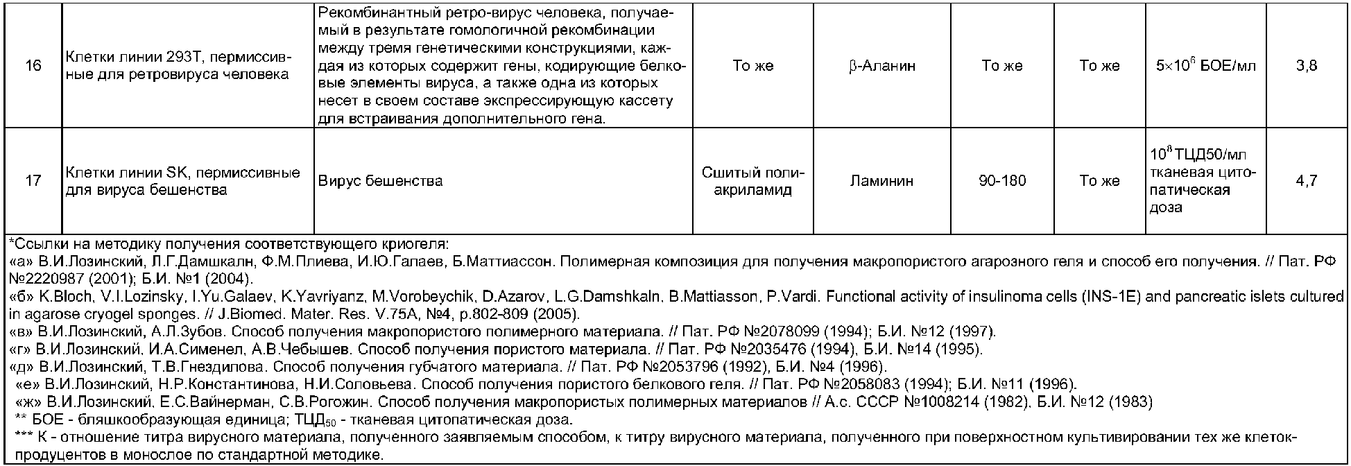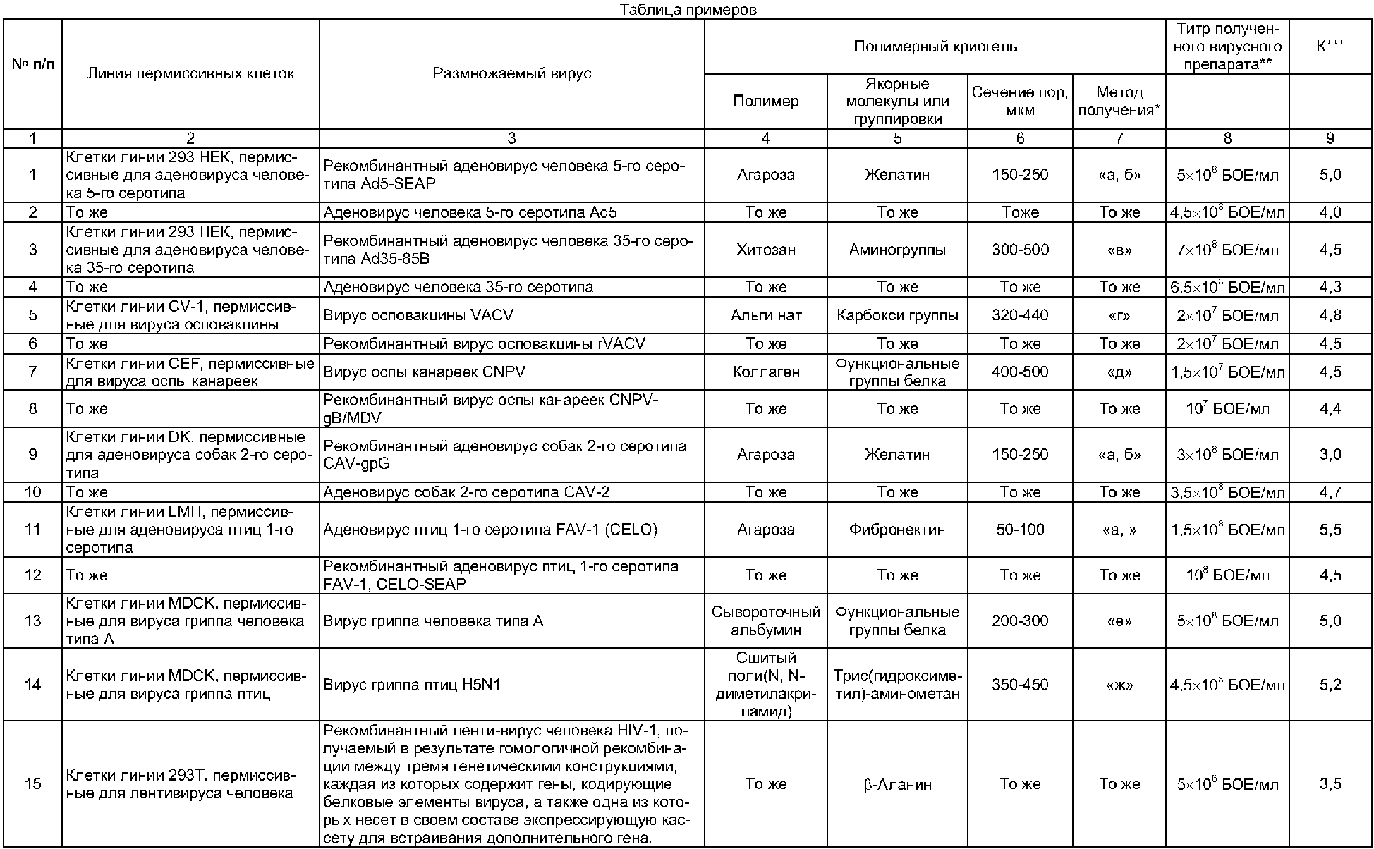 Такое сочетание признаков, как совокупность используемых в заявляемом техническом решении операций процесса размножения вируса и применяемых для этого нерастворимых пористых носителей – полимерных криогелей, ранее известно не было, поэтому предлагаемое изобретение отвечает критерию «новизна». Ниже приводится конкретный типичный пример реализации предлагаемого способа; остальные примеры, подтверждающие широту заявляемых его диапазонов, сведены в таблицу. Пример. Размножение аденовируса Ad5-SEAP а) Размножение вируса по стандартной методике (контроль) Пермиссивные для аденовируса человека 5-го серотипа клетки линии 293 культивируют в 162 см2-культуральном флаконе в среде DMEM с добавлением 5% фетальной бычьей сыворотки. Затем 104 клеток данной культуры, содержащиеся в объеме культуральной среды, равном 0,5 мл, вносят в культуральную пластиковую чашку диаметром 3 см, затем добавляют 1,5 мл питательной среды DMEM с 5% фетальной бычьей сыворотки. Клетки инкубируют в течение 24 часов при 37°С и 5% СО2, после чего их инфицируют вирусом Ad5-SEAP в количестве 150 БОЕ/кл. Через 48 ч после инфекции, после наступления цитопатического действия вируса (данные микроскопирования), клетки с культуральной средой трехкратно перемораживают для разрушения клеток и выхода вируса. Титр вируса Ad5-SEAP, содержащегося в культуральной среде, составляет 108 БОЕ/мл. б) Размножение вируса заявляемым способом Пермиссивные для аденовируса человека 5-го серотипа клетки линии 293 культивируют в 162 см2-культуральном флаконе в среде DMEM с добавлением 5% фетальной бычьей сыворотки. Затем 5×104 Таким образом, заявляемый способ имеет следующие преимущества по сравнению с аналогами и прототипом: 1) в противоположность способу-прототипу заявляемое техническое решение избавлено от нежелательного эффекта постепенного «забивания» пор носителя растущей культурой и клеточным дебрисом. Это обусловлено как крупнопористостью используемого носителя (полимерный криогель с сообщающимися порами сечением 50-500 мкм), так и стационарным режимом культивирования пермиссивных для конкретного вируса клеток (т.е. отсутствием потоков жидкой среды в системе). 2) Поскольку развитая поверхность стенок макропор в полимерных криогелях имеет большую площадь участков малой степени кривизны, то заявляемый способ обладает существенно большей по сравнению с прототипом универсальностью в отношении типов пермиссивных клеток, т.к. в таком носителе имеются благоприятные условия (ровные площадки) для прикрепления (адгезии) субстрат-зависимых клеток к материалу носителя и их «распластывания». Кроме того, в заявляемом способе для адгезии клеток к такому носителю используется не только внешняя поверхность носителя, как в способе-прототипе, а большая площадь стенок макропор полимерного криогеля, т.е. более эффективно используется весь объем носителя и, как следствие, дорогая культуральная среда.