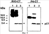На Фиг.9 показаны результаты иммуноблот-анализа ЭК расщепления RX3-СТ и Р4-СТ слитого белка. 12 мкг каждого частично очищенного слитого белка инкубировали с 0,2 U ЭК в течение 24 часов при 20°С. Гидролизованные слитые белки фракционировали с использованием 18% Трис-трицин-полиакриламидного гель-электрофореза и переносили в нитроцеллюлозу. Полосы 1 – негидролизованные слитые белки (1 мкг); полосы 2 – гидролизованные продукты; полосы 3 – стандарт, синтетический лососевый СТ.