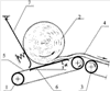 Рулон 2, подготовленный к разматыванию, устанавливается на верхнюю ветвь 5 ленты транспортера 1. Включаются транспортеры 1 и 3 для удержания и вращения рулона 2 и для отвода слоя 4 и происходит разматывание рулона 2 и формирование слоя 4, который отводится из зоны разматывания транспортером 3. Жесткая плоская направляющая 6 под верхней ветвью 5 транспортера 1 обеспечивает незначительную поверхность контакта рулона 2 с ветвью 5 транспортера 1 (при идеальной форме рулона этот контакт должен осуществляться по прямой линии). Под влиянием собственного веса рулона в зоне его контакта с лентой транспортера возрастают деформации, в первую очередь в поверхностных слоях. Это приводит к перераспределению нормальных и касательных напряжений между стеблями в рулоне, что способствует разрушению (или ослаблению) связей между ними и лучшему отделению слоя стеблей и его формированию при разматывании рулона. Отмеченный эффект усиливается при разматывании неравномерного по диаметру и плотности рулона – в этом случае будут возникать более интенсивные деформации. При разматывании неравномерного по диаметру и плотности рулона, а также при уменьшении его диаметра в устройстве предусмотрено изменение угла наклона к горизонтали жесткой плоской направляющей 6, что будет способствовать более равномерному (без рывков) вращению рулона 2. Наклонная подпружиненная стенка 7 также способствует этому.
