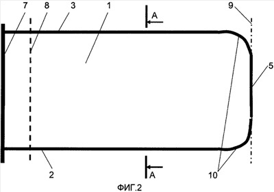 На участке скважин, непосредственно примыкающем к дневной поверхности, формируют жесткую обсадку на длину скважины, соответствующую ширине охранного целика 8. Далее выемку угля в пределах контура скважины ведут без крепления, прижимая скважину к почве пласта. Расстояние между скважинами принимают порядка 60 -120 м в зависимости от конкретных горно-геологических условий. Глубина бурения определяется техническими возможностями оборудования и отсутствием нарушений с амплитудой, исключающей ее переход используемым комплектом оборудования. Технология формирования каналов предусматривает формирование пилотной скважины на всю длину с последующим ее расширением обратным ходом до проектных размеров. При приближении к проектной границе 9 участка, предназначенного для газификации (на расстояние, диктуемое минимально возможным радиусом криволинейных участков 10, проходимых используемым комплексом), начинают работу по сбойке скважин 2 и 3 (формируют участок сбойки 4), разворачивая рабочие органы мобильного бурового комплекса направленного бурения встречно друг другу. Непосредственно перед сбойкой работу ведут только с одной стороны. Соединение сформированных таким образом каналов осуществляют известным образом взрывным способом или гидроразрывом. В последнем случае можно использовать гидромонитор с гибким ставом, работая им из забоя одной из скважин (при этом необходимо предварительно определить, например с использованием геофизических методов, взаимное положение забоев скважин 2 и 3).