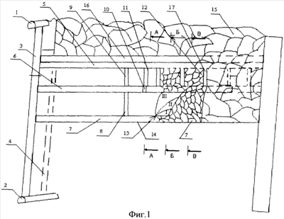Для предотвращения перепуска пород из верхних отработанных подэтажей 15, над вентиляционным штреком 5, по простиранию пласта оставляется временный подзавальный целик 16. Подготовленный для выпуска уголь 12 из верхнего подэтажа сохраняется также за счет временных подзавальных целиков 17, оставляемых в подэтаже на определенном расстоянии друг от друга, зависимом от устойчивости боковых пород по простиранию пласта. После выпуска угля в подэтажах с помощью гидромонитора вынимают временные подзавальные целики.